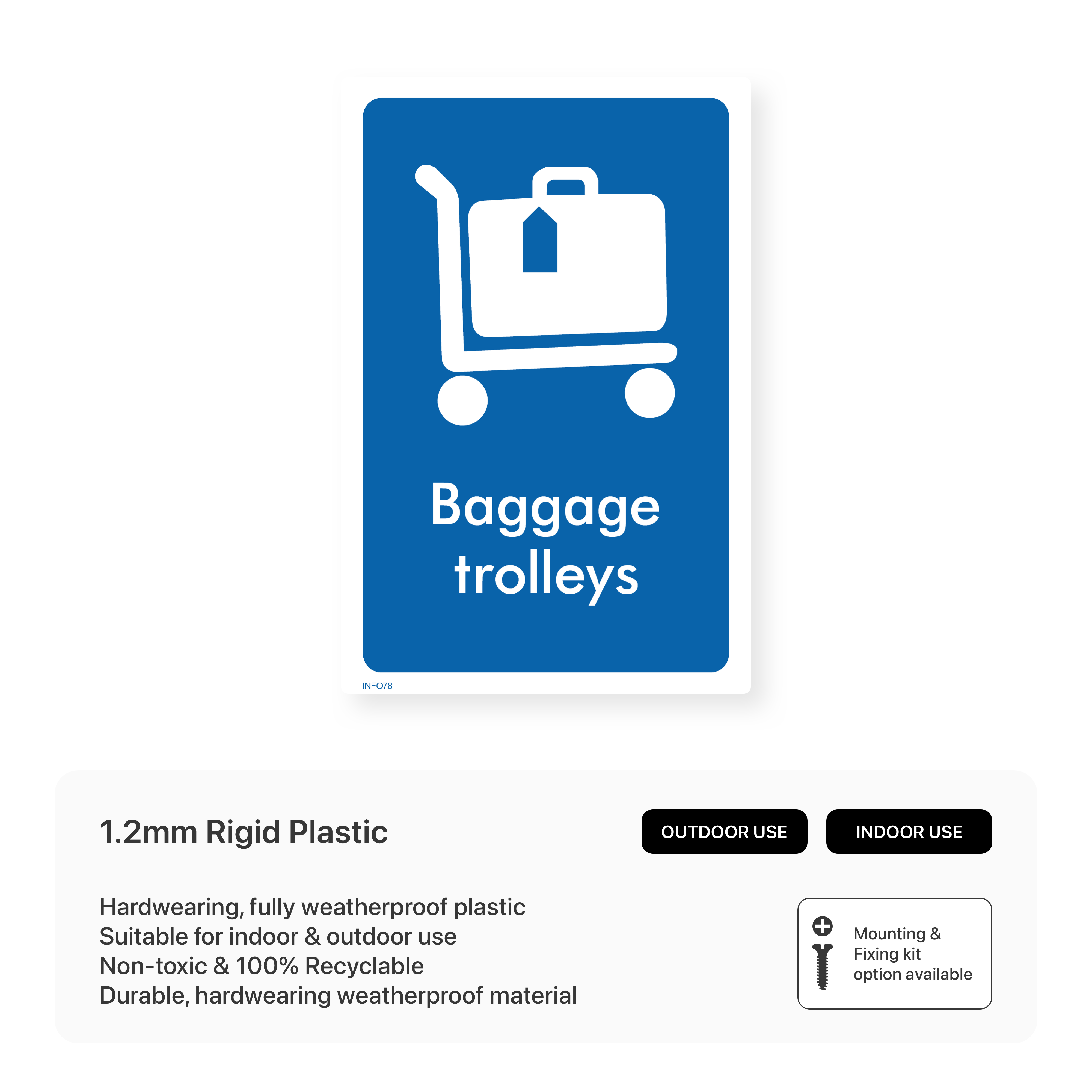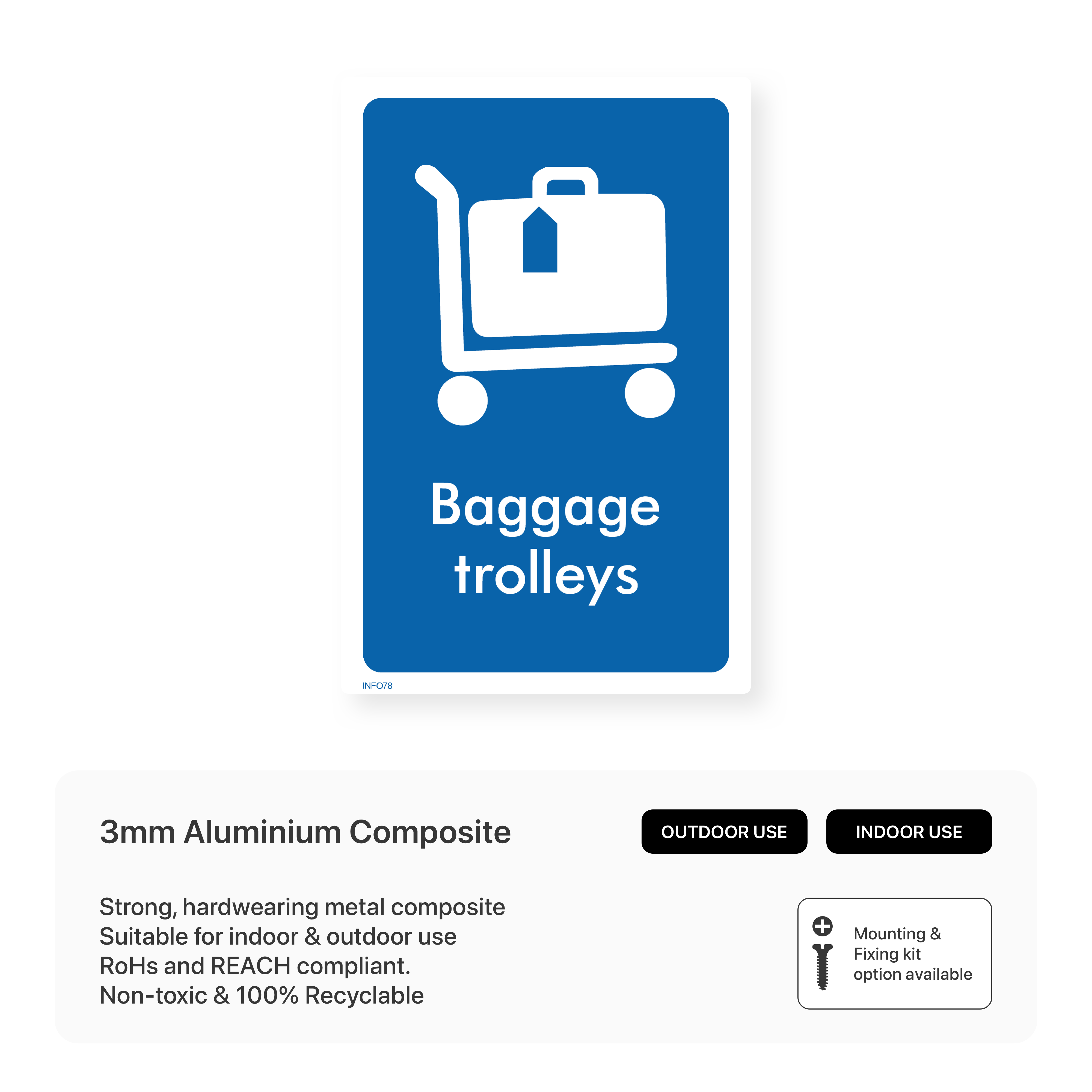 Clearly mark the location of baggage trolleys with our "Baggage trolleys" sign. This sign helps travelers easily find the trolleys, making it convenient for them to transport their luggage.
