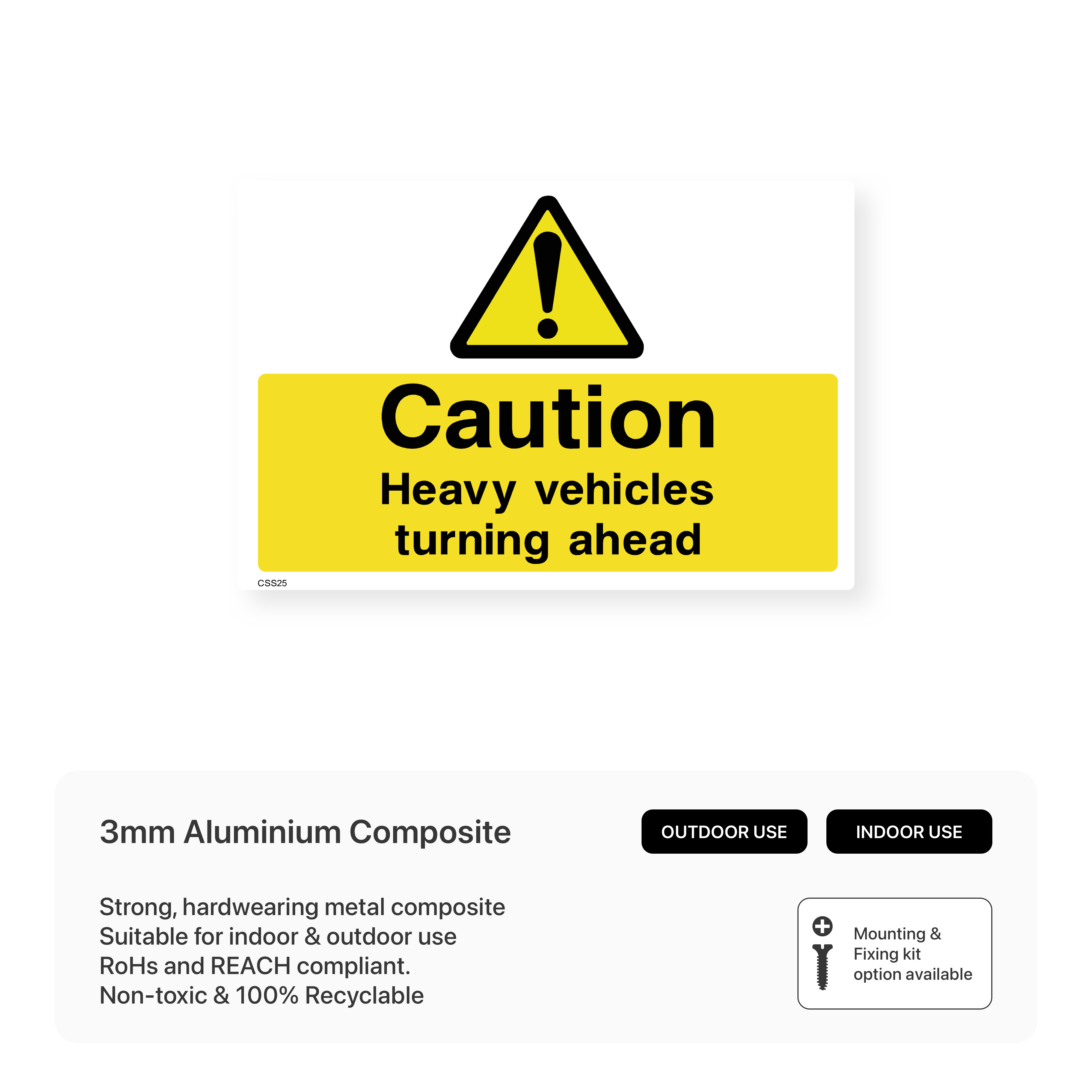 Alert drivers and pedestrians to the presence of heavy vehicles turning ahead with our "Caution heavy vehicles turning ahead" sign. This sign helps prevent accidents and ensures the safety of everyone on site, particularly in areas with limited visibility.