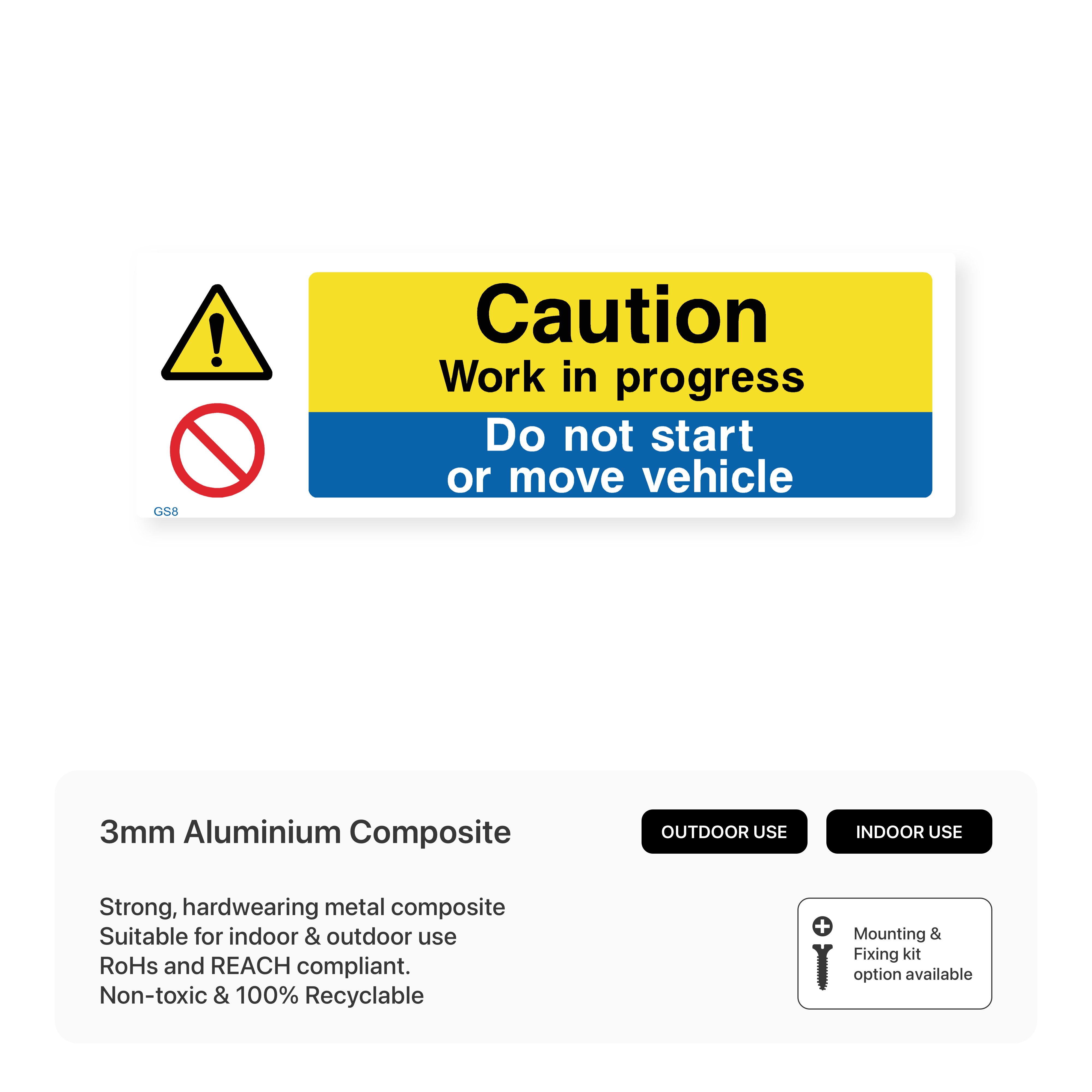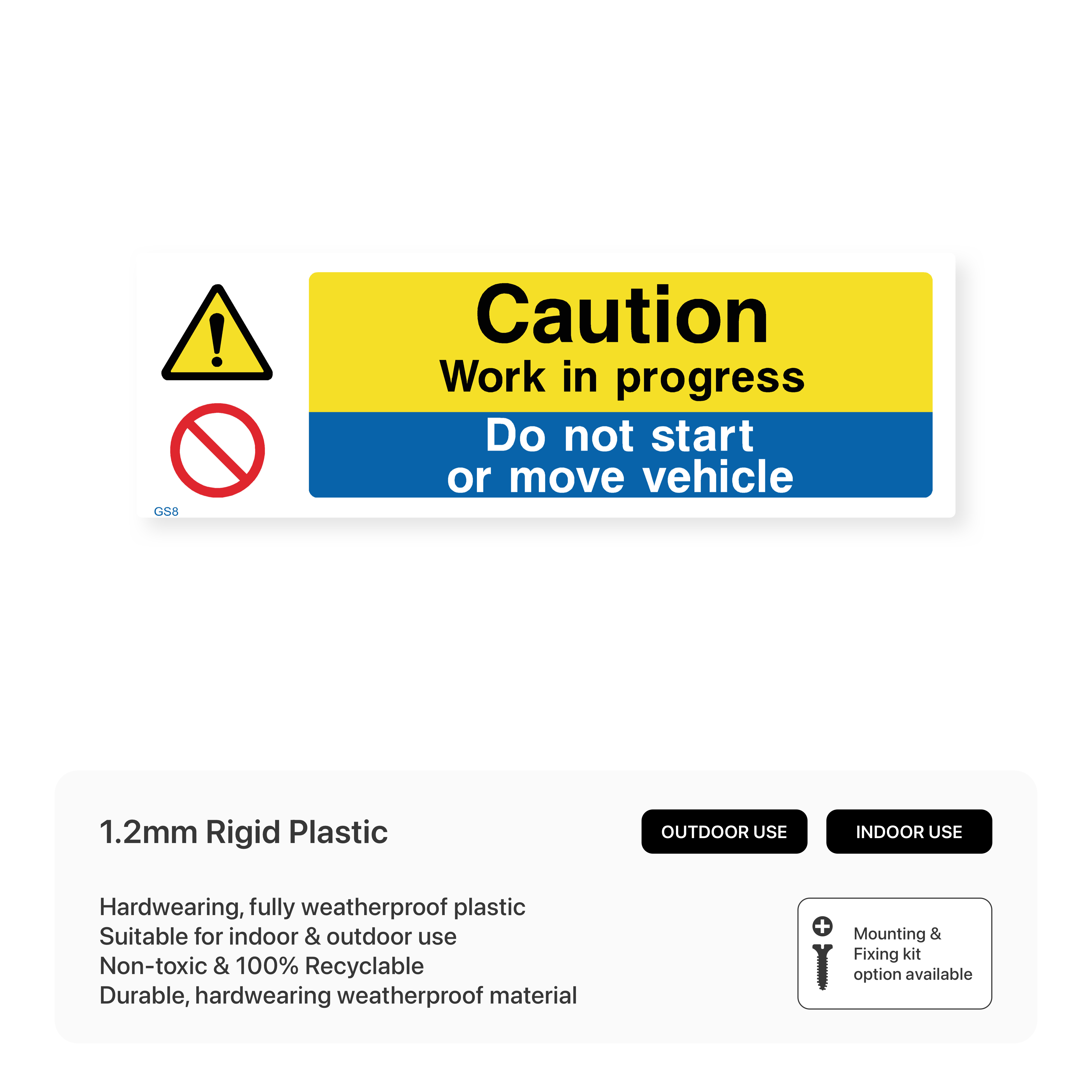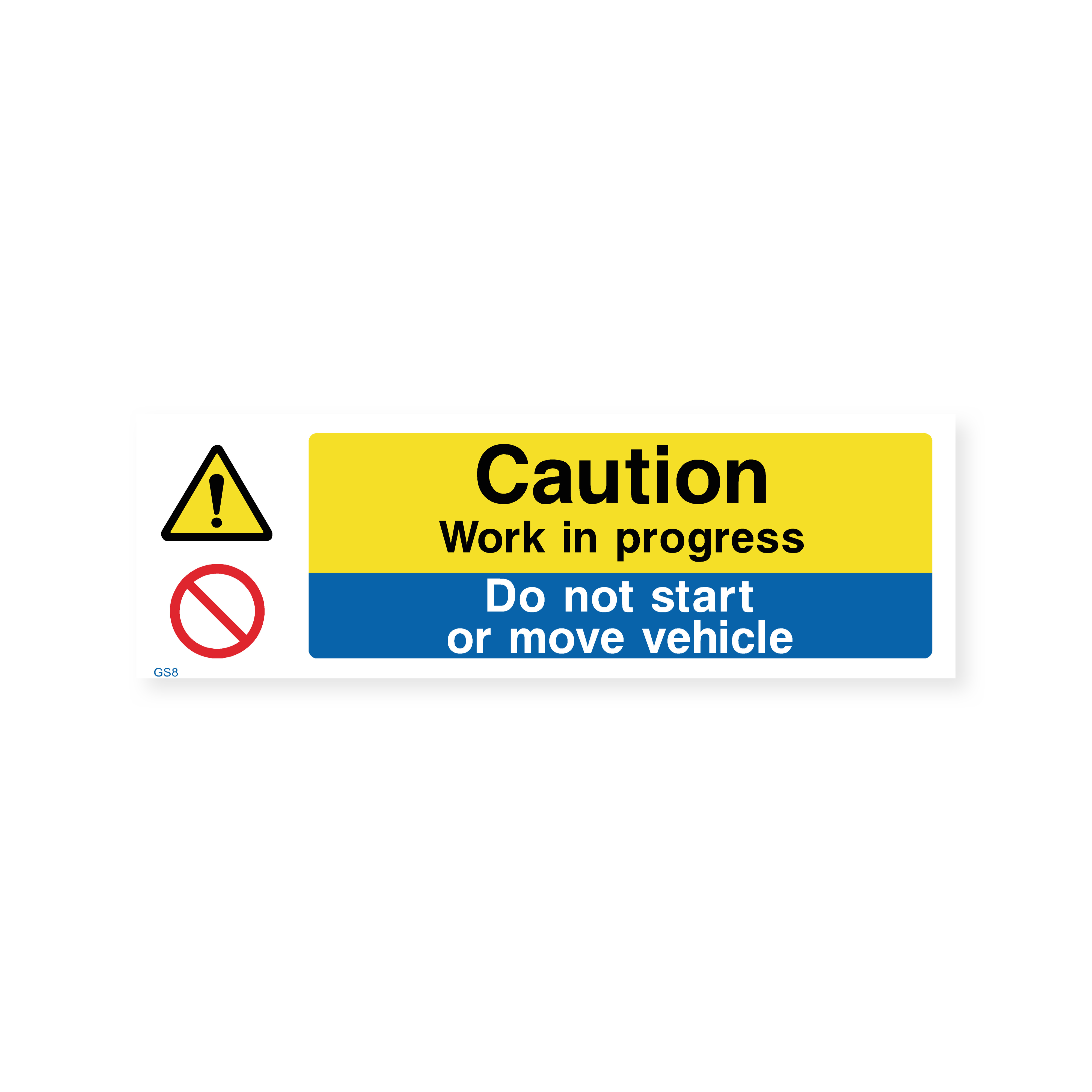 Ensure safety in your garage with our "Caution - Work in progress - Do not start or move vehicles" sign. This sign clearly indicates ongoing work and instructs individuals not to start or move vehicles, preventing accidents and damage.