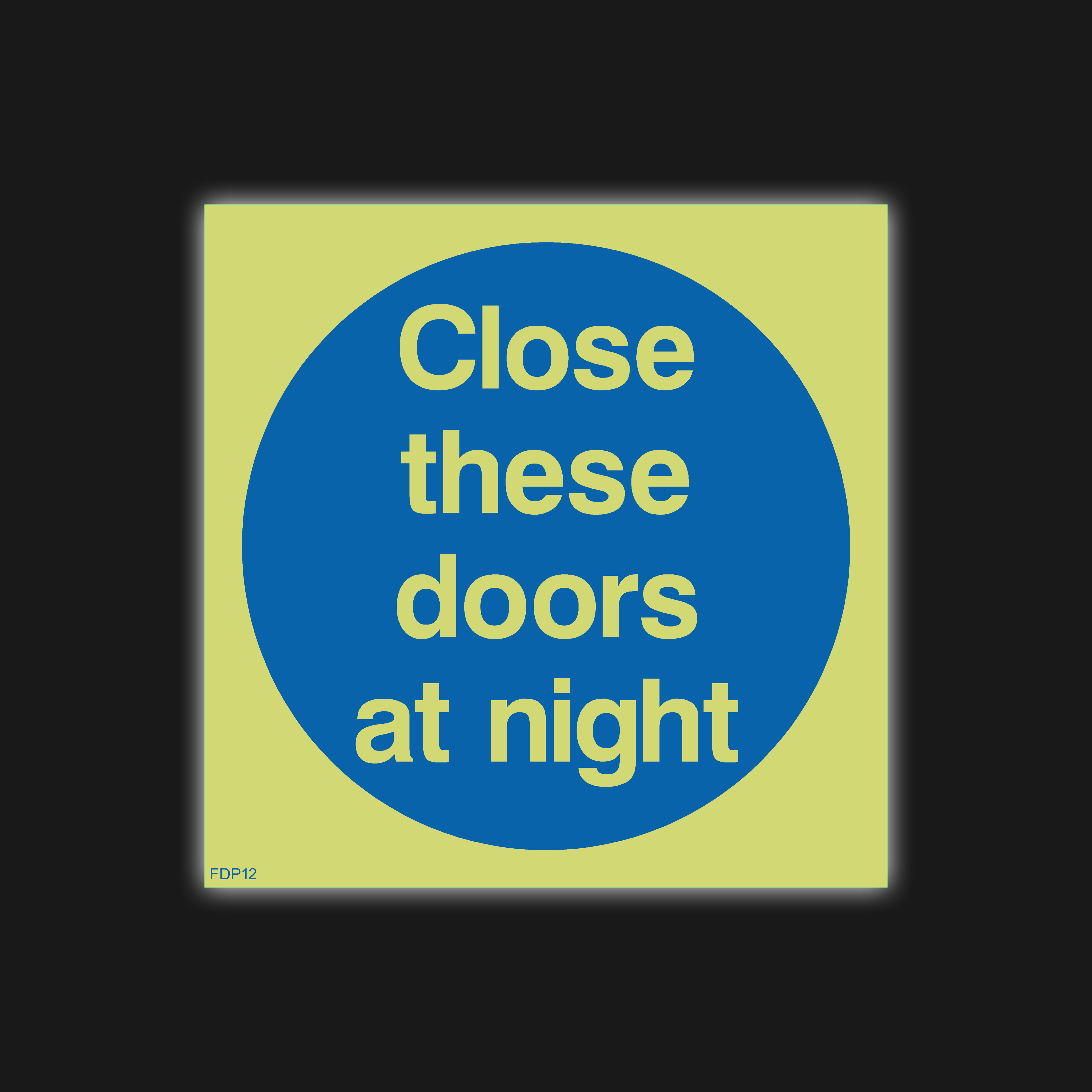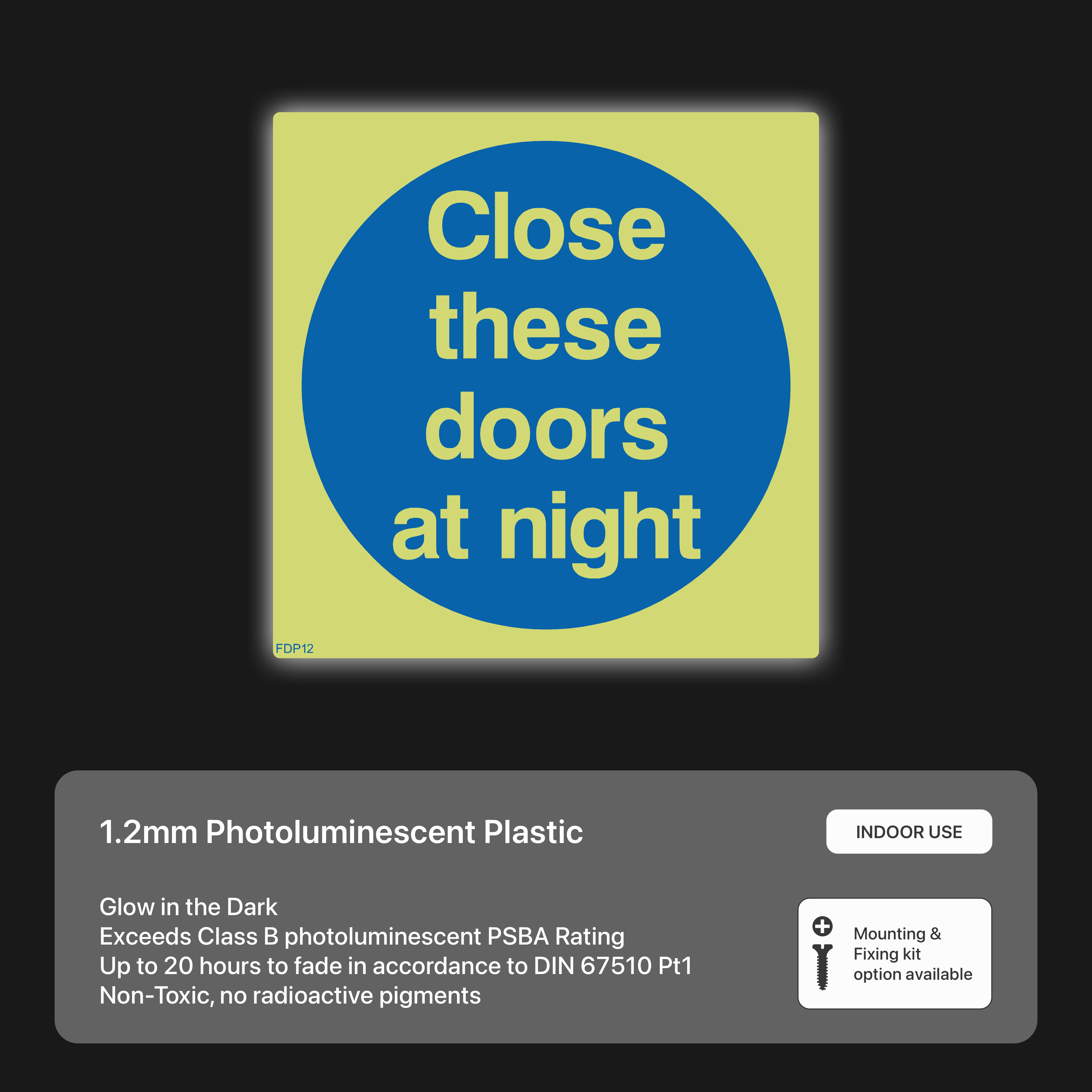 Ensure security and energy efficiency with our "Close these doors at night" sign. This sign reminds individuals to close doors at the end of the day, helping to deter unauthorized entry and maintain comfortable temperatures within the building.