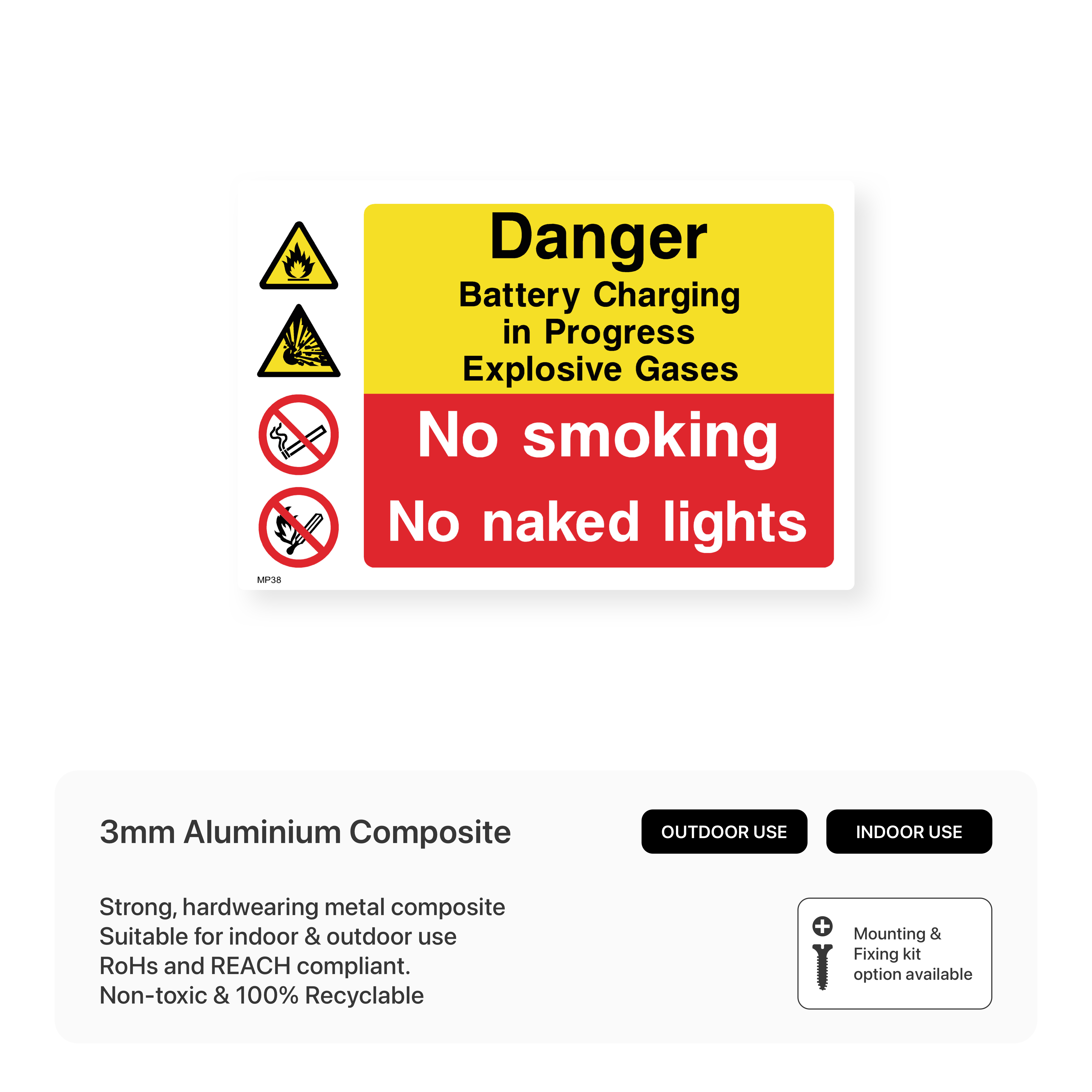 Ensure safety during battery charging with this comprehensive safety sign. It warns of the presence of explosive gases produced during charging and prohibits smoking and the use of naked lights to prevent accidents and fires. Ideal for workshops, garages, and any facility where batteries are charged.