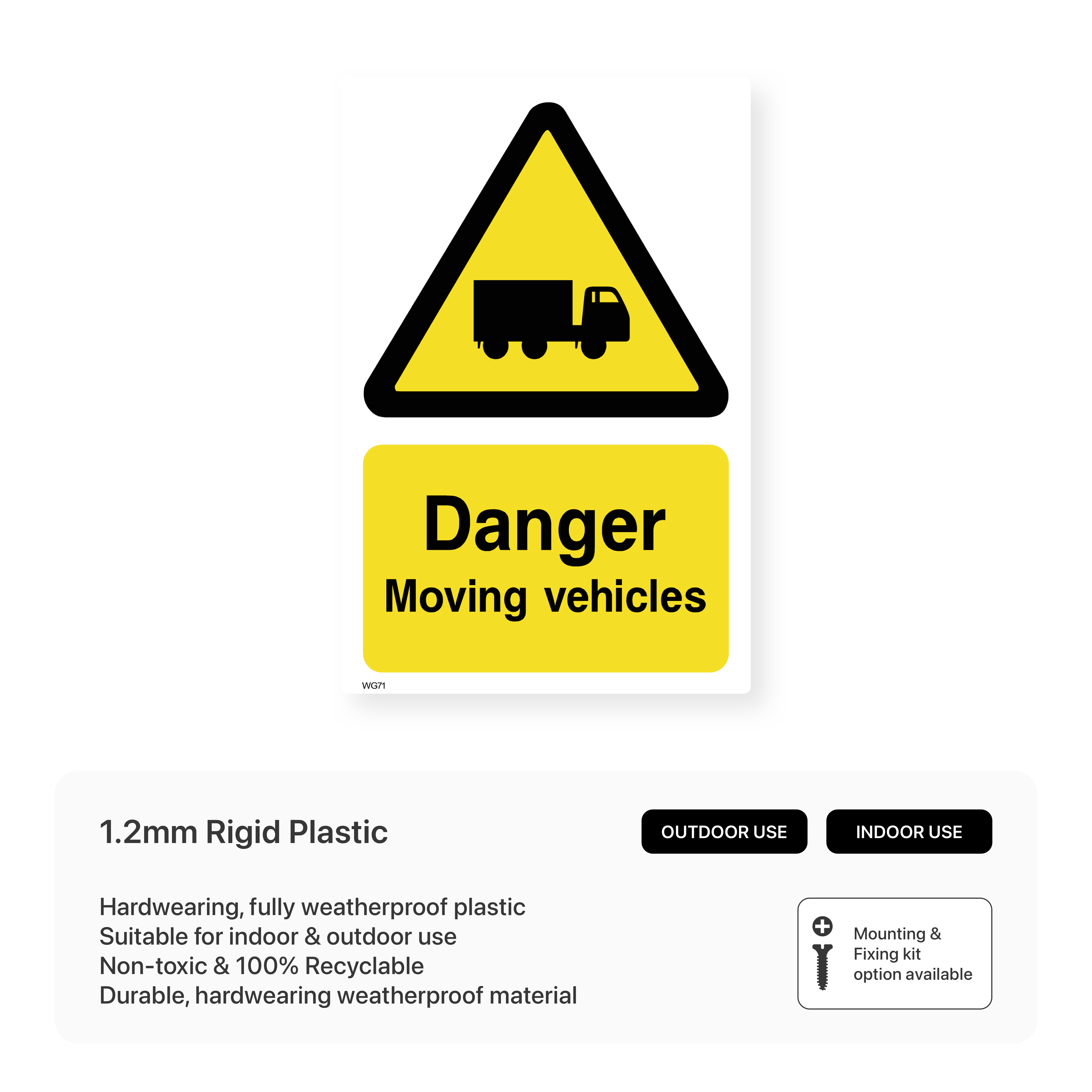 Prioritise safety in areas with vehicle traffic using our "Danger - Moving Vehicles" sign. This clear warning helps prevent accidents and injuries by alerting pedestrians and workers to the presence of moving vehicles. Ideal for roads, car parks, and industrial sites.