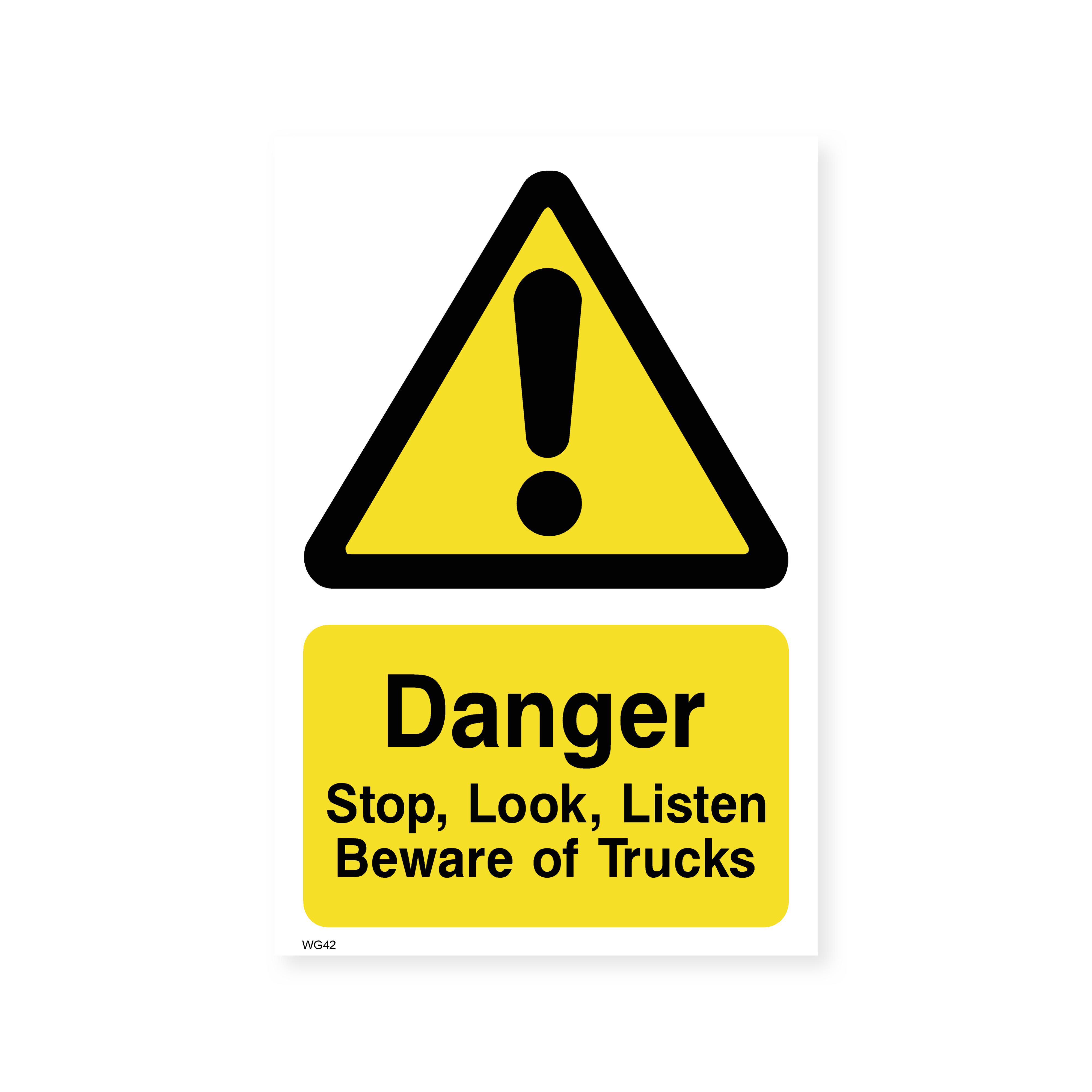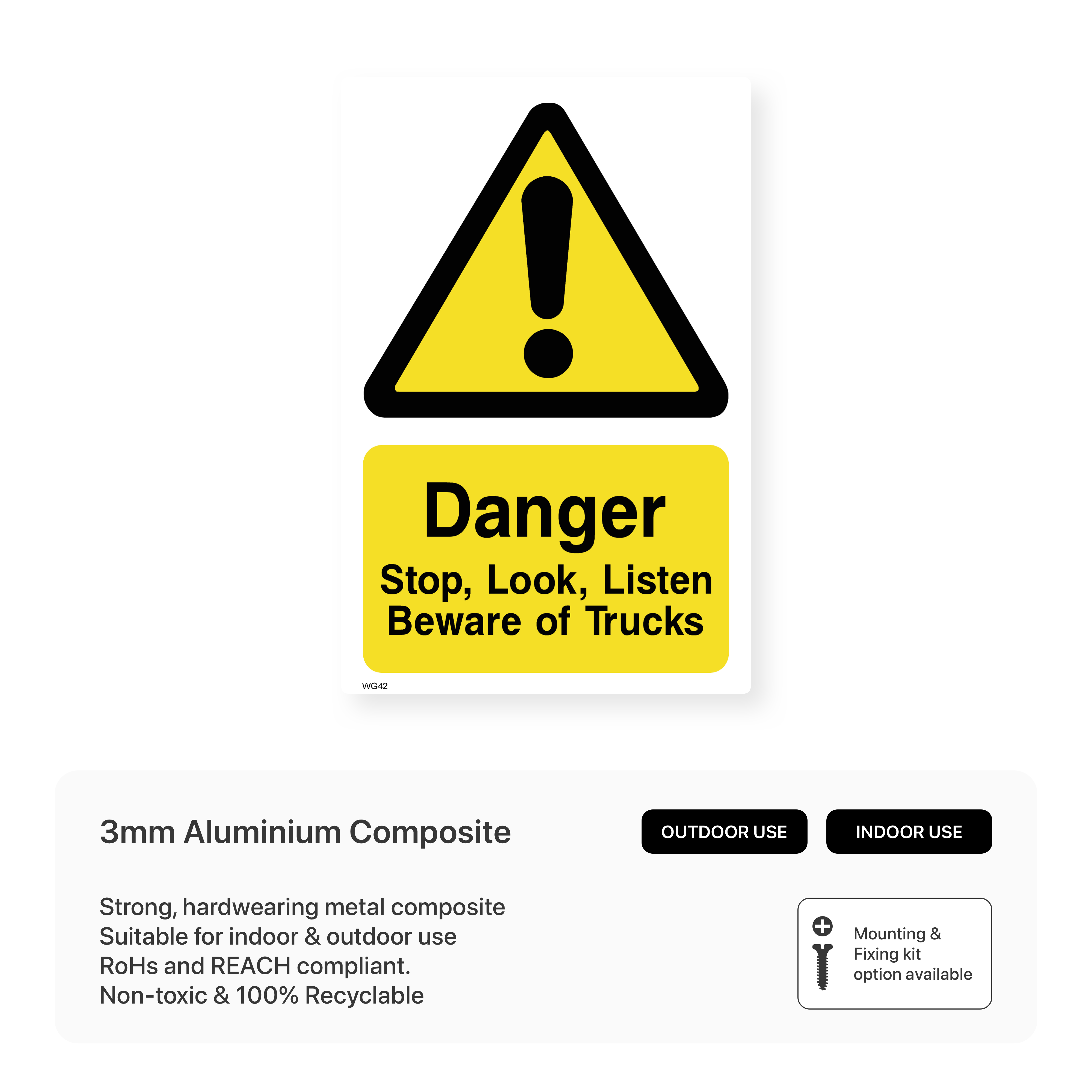 Ensure safety at lorry crossings with our "Danger - Stop, Look, Listen, Beware of Trucks" sign. This sign clearly warns pedestrians and drivers to exercise caution and be aware of potential hazards from heavy goods vehicles. Ideal for industrial sites, warehouses, and loading areas.