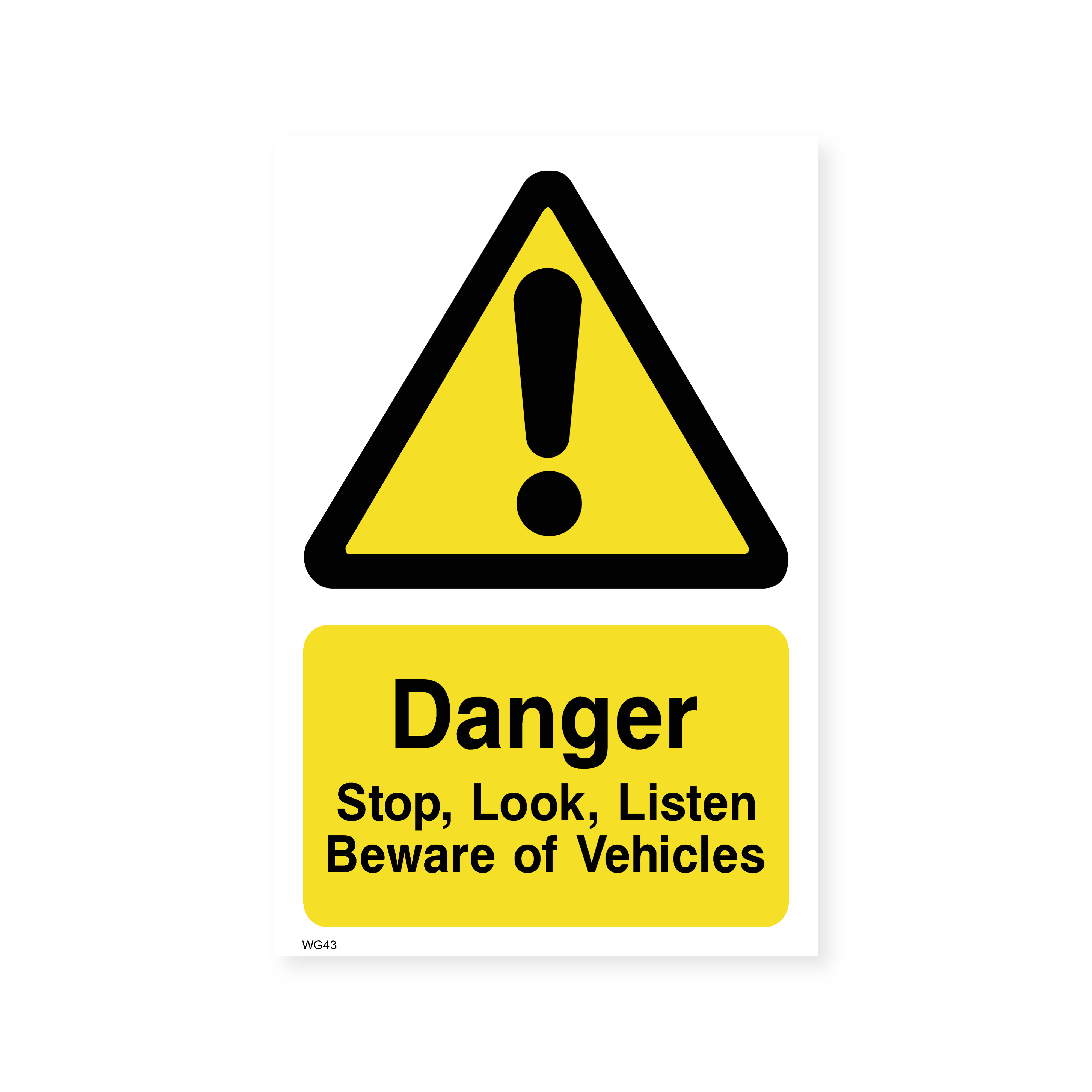Promote safety in areas with vehicle traffic using our "Danger - Stop, Look, Listen, Beware of Vehicles" sign. This sign effectively warns pedestrians and drivers to exercise caution and be aware of oncoming traffic. Ideal for roads, car parks, and industrial sites.