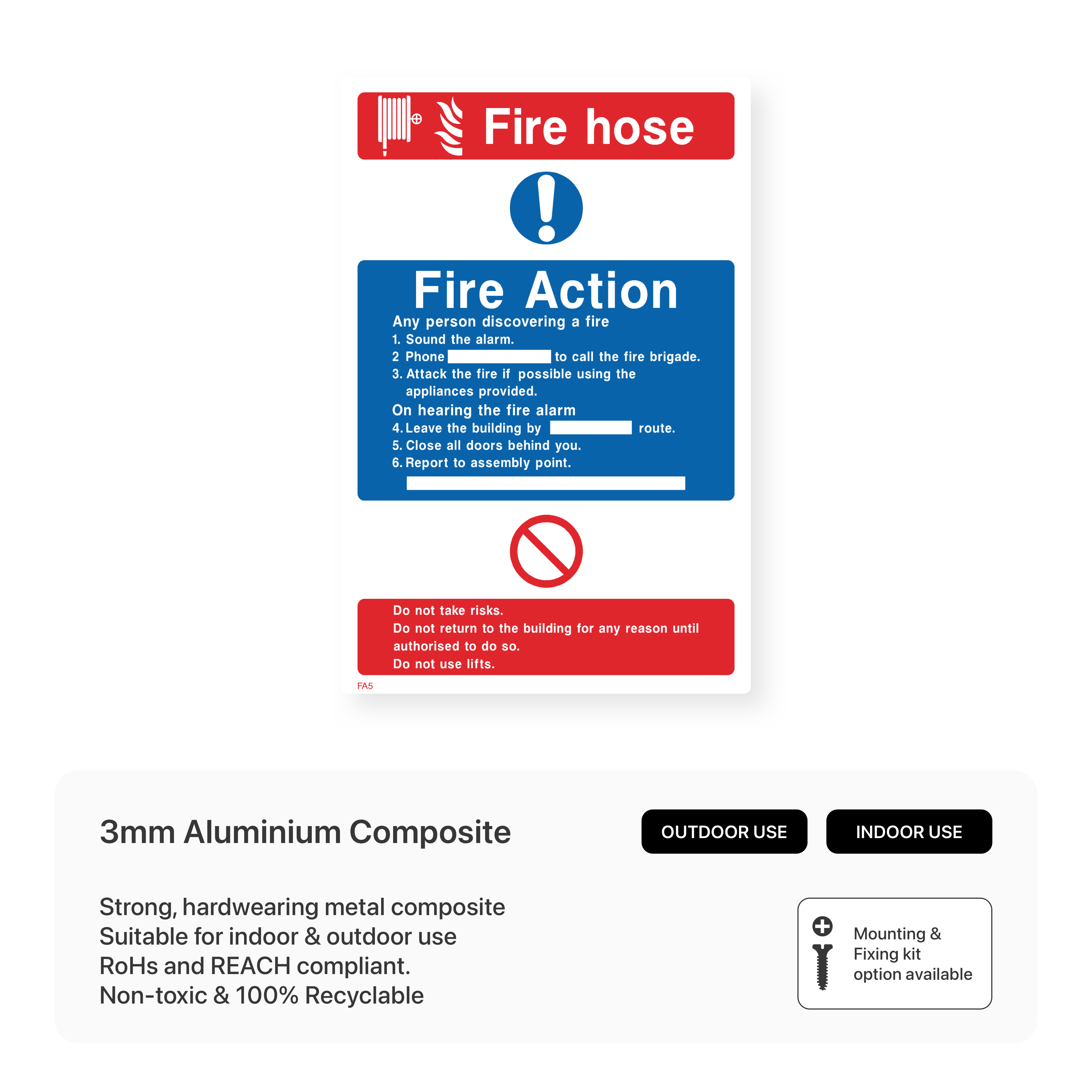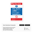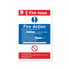 Clearly mark fire hose locations with our "Fire Hose - Fire Action" sign. This sign helps individuals quickly locate and access fire hoses in case of fire, enabling them to take immediate action and potentially contain the fire until professional help arrives.