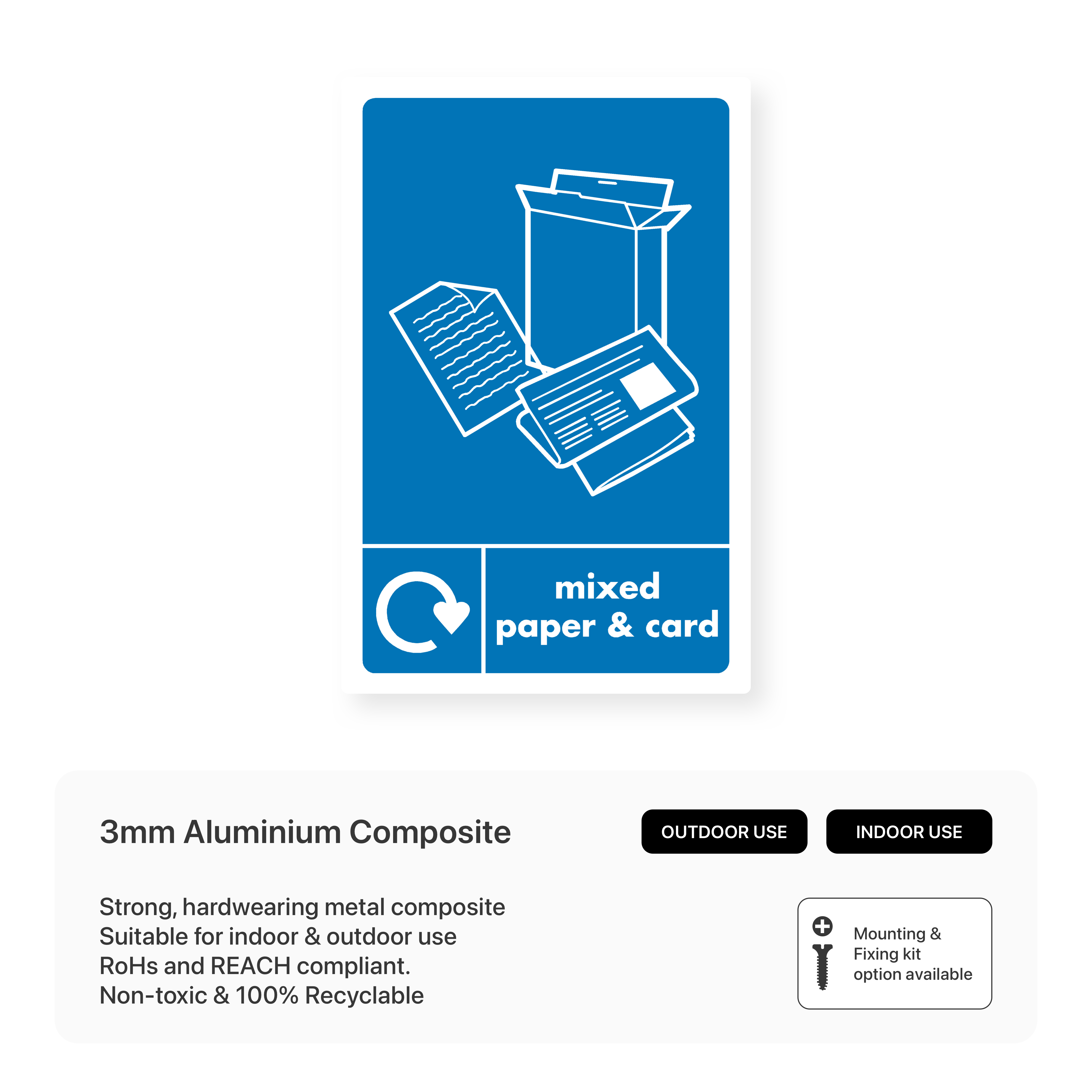 Mixed Paper & Card - Portrait - Recycling: Encourage recycling of mixed paper and card with this portrait-oriented informative sign. Help reduce waste and conserve resources by directing these materials to the correct recycling bins.