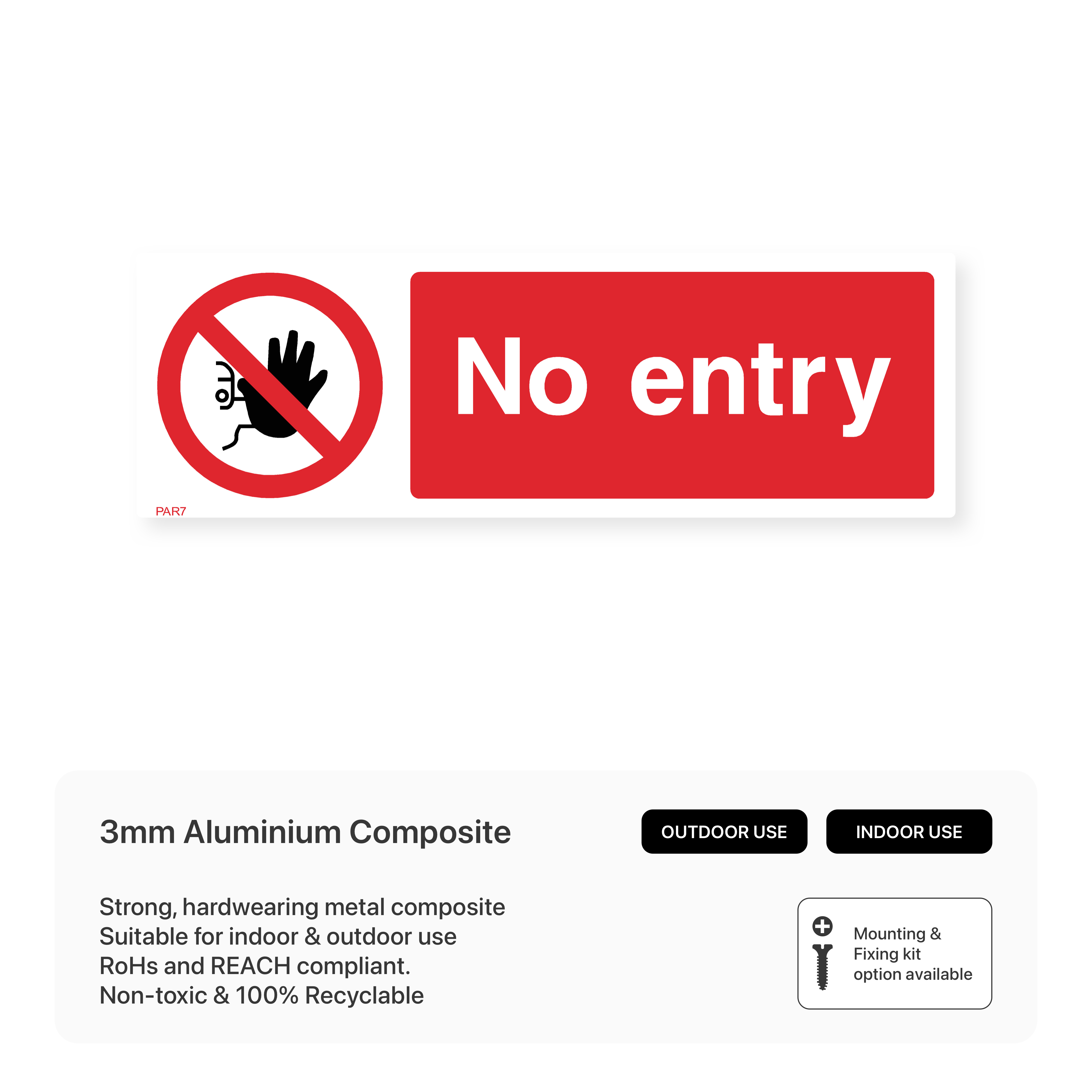 Clearly indicate restricted areas with our bold "No Entry" sign. This sign leaves no room for ambiguity, effectively preventing unauthorised access and ensuring safety and security. Choose from various sizes and materials to suit your specific needs and maintain control over access to your premises.