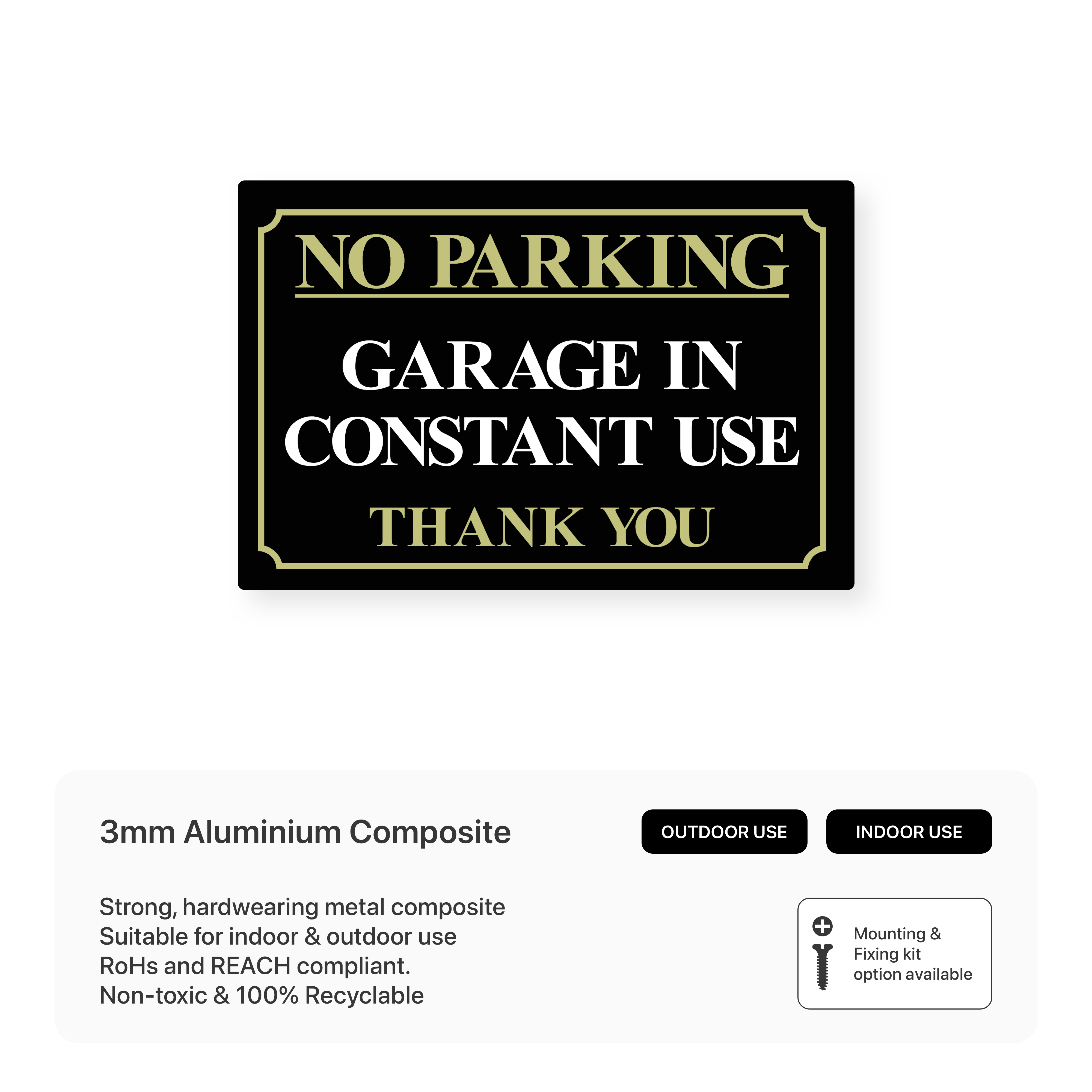 Prevent parking obstructions with our "No Parking - Garage in constant use - Thank you" sign. This sign clearly communicates that the garage is frequently used and parking is not permitted, ensuring that vehicles can enter and exit without hindrance.