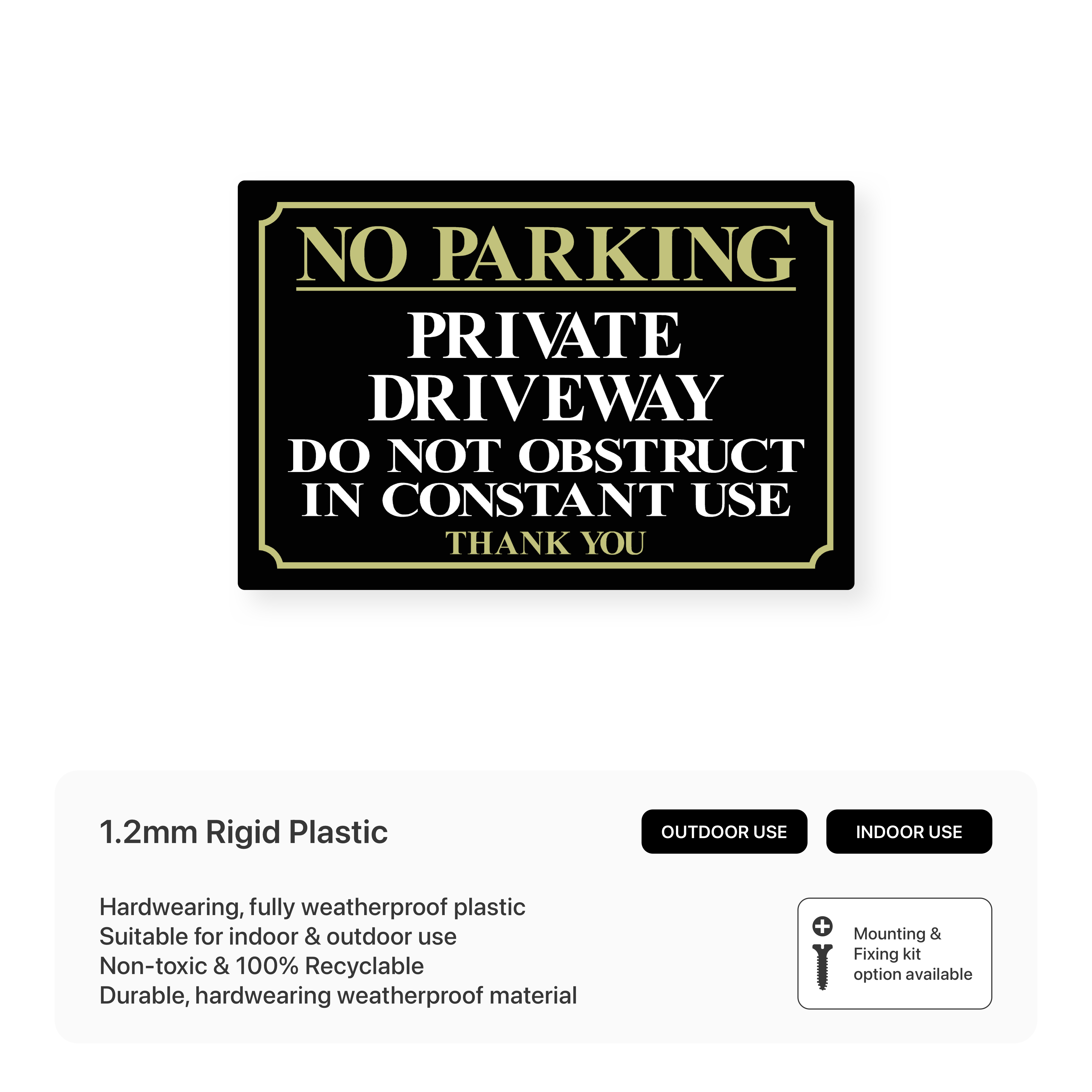 Protect your private driveway from unwanted parking with our "No parking - Private driveway - Do not obstruct in constant use - Thank you" sign. This sign clearly communicates parking restrictions and ensures clear access for residents and authorized vehicles.