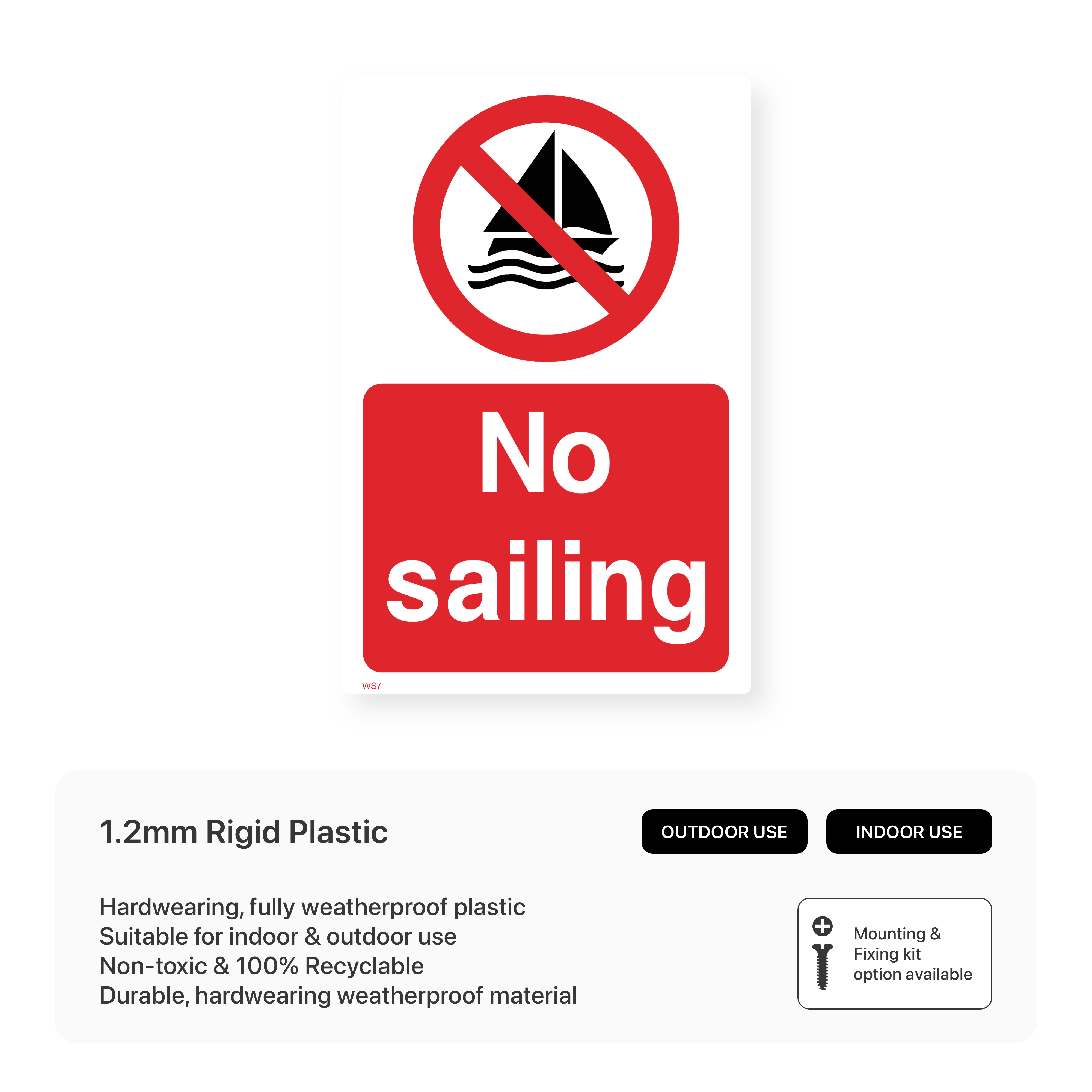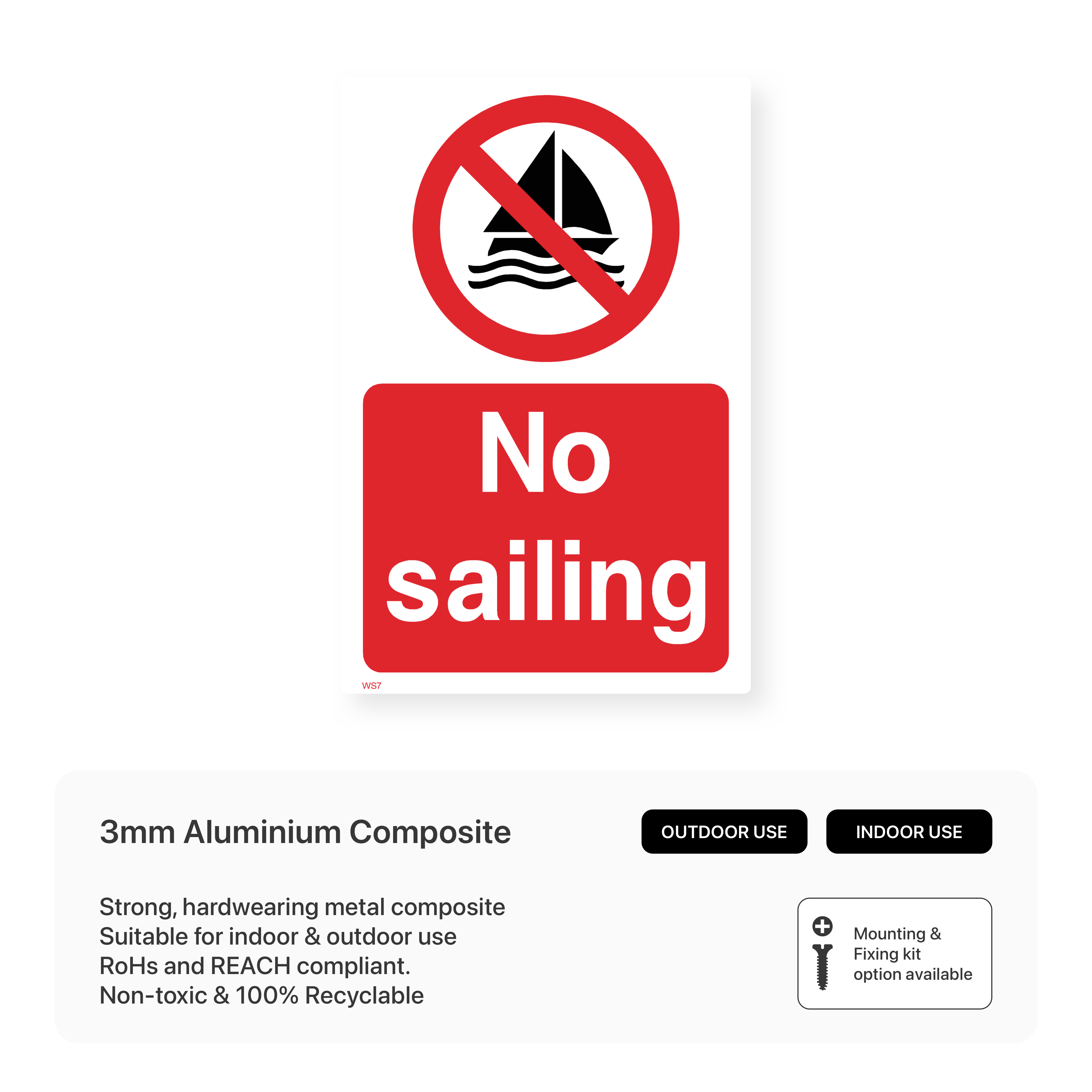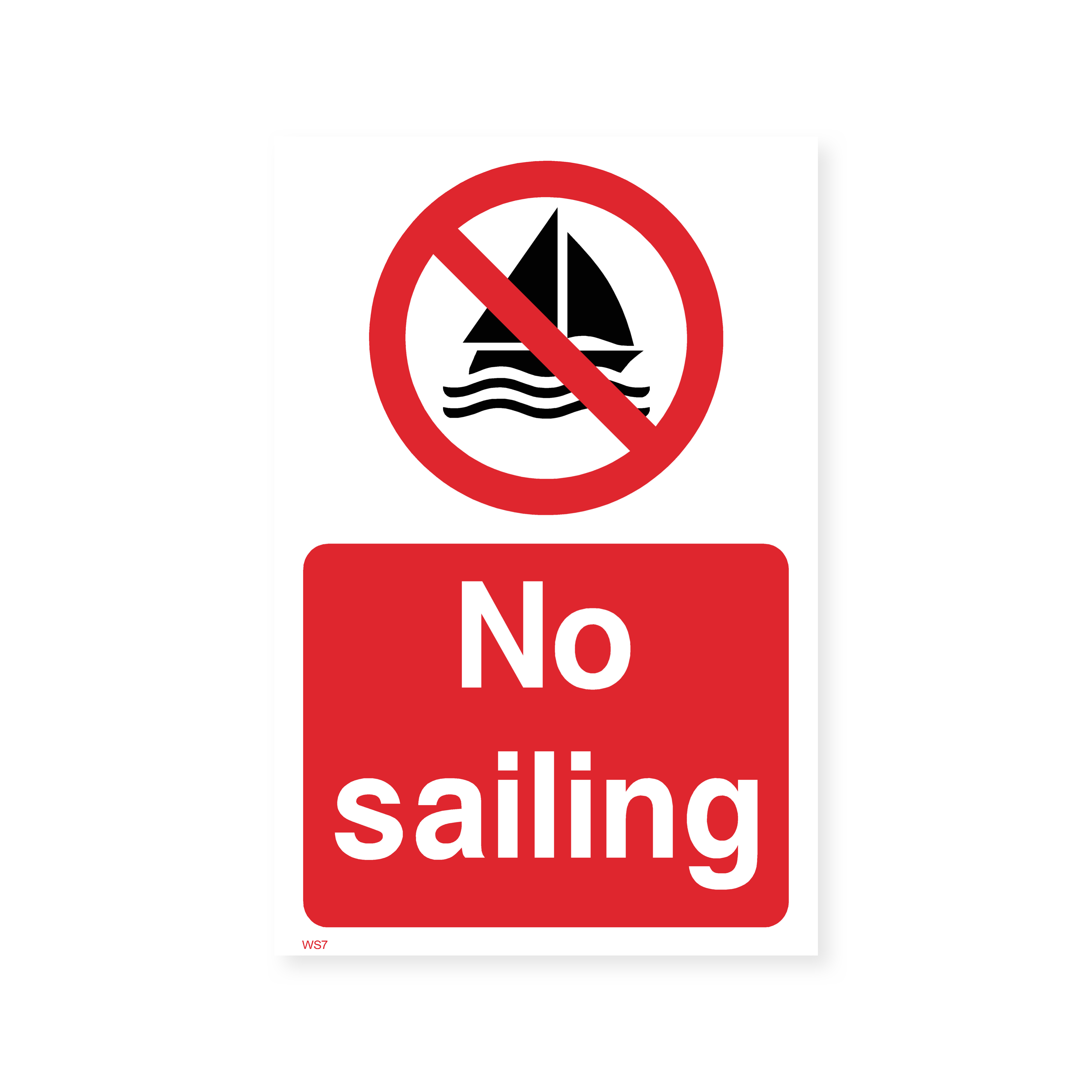 Clearly mark areas where sailing is prohibited with our "No Sailing" sign. This sign helps prevent accidents and conflicts between different water activities. Ideal for swimming areas, restricted zones, and other locations where sailing is not allowed.