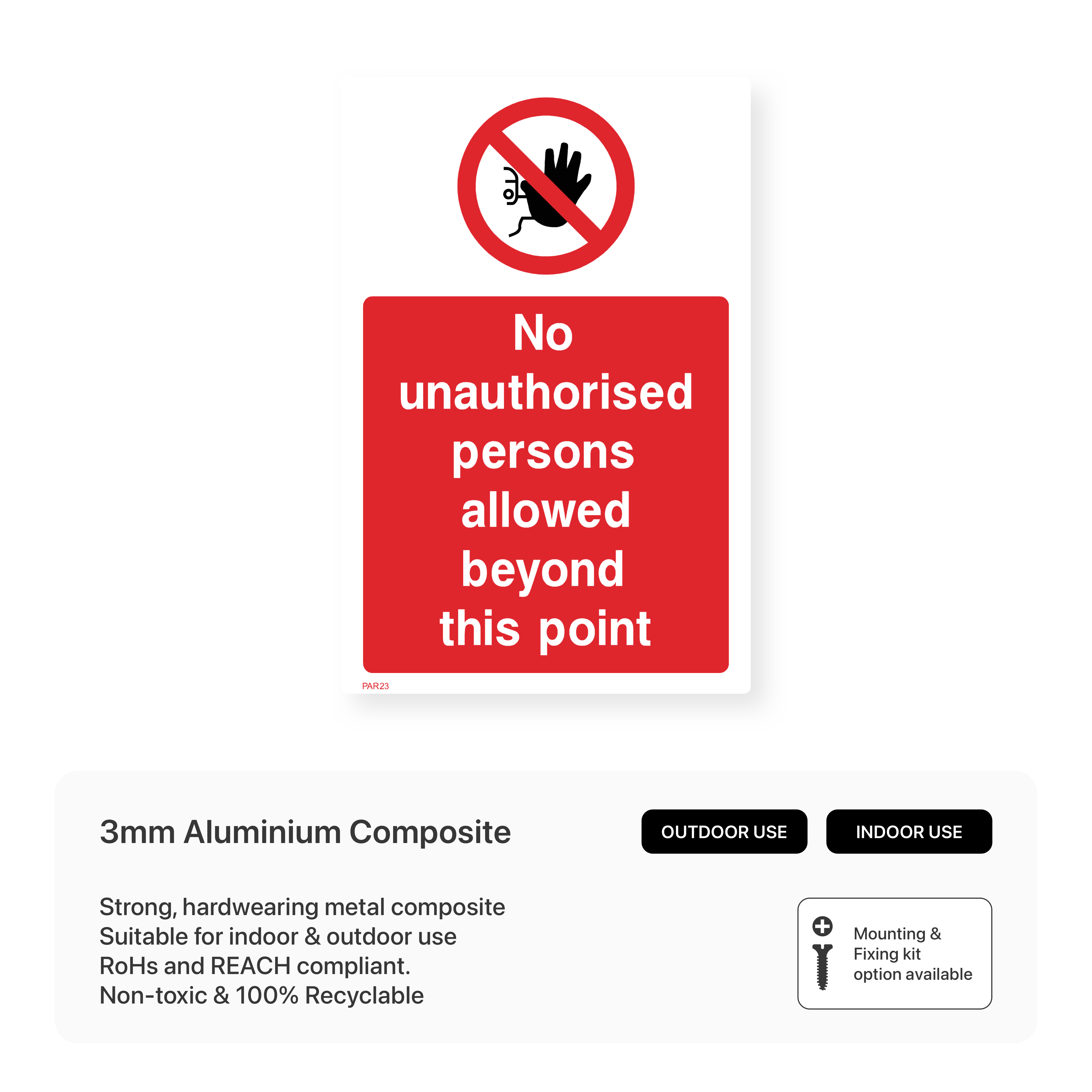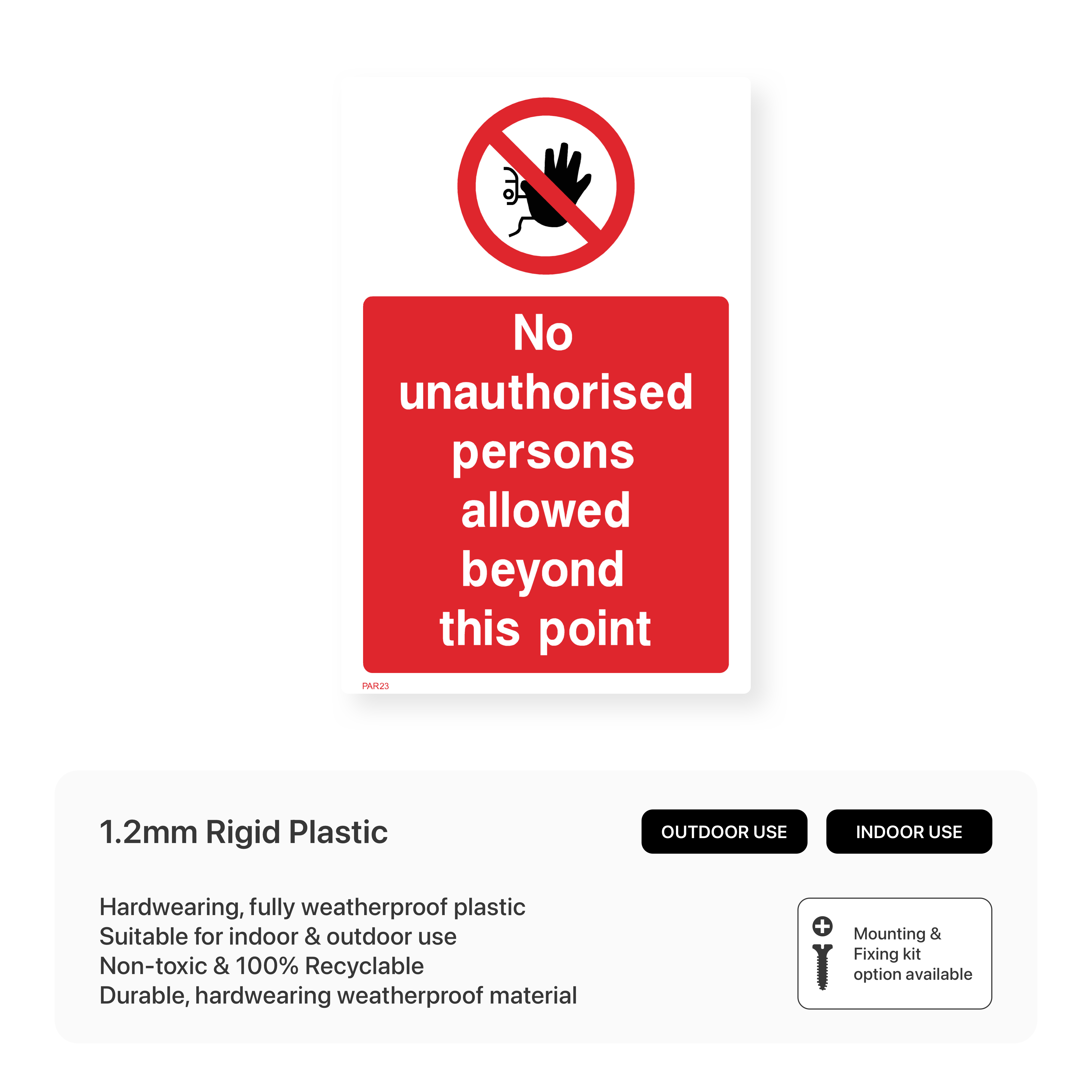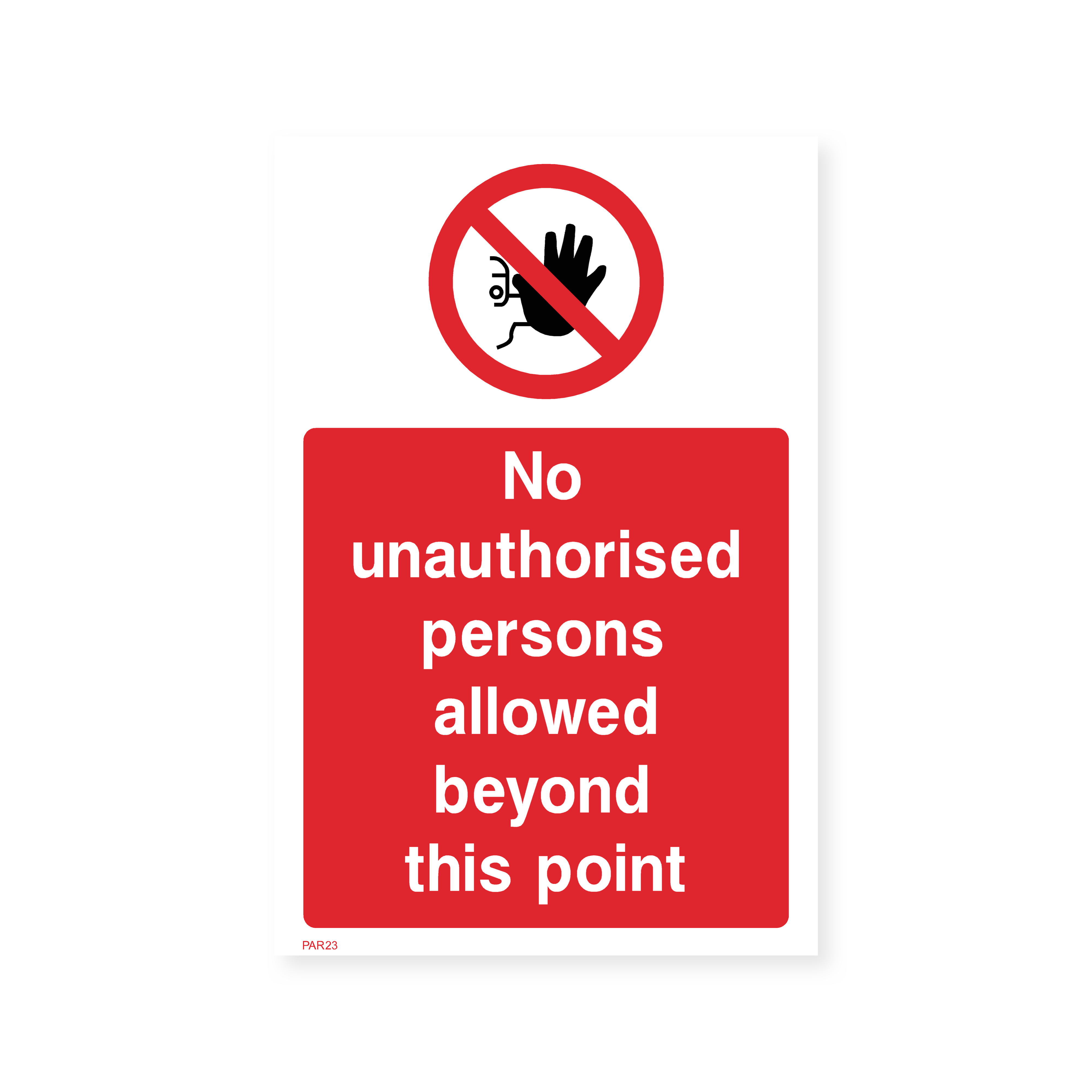 Clearly mark restricted areas with our durable "No Unauthorised Persons Allowed Beyond This Point" portrait sign. This sign effectively deters unauthorised entry and maintains safety and security in your premises. Choose from various sizes and materials to suit your specific needs.