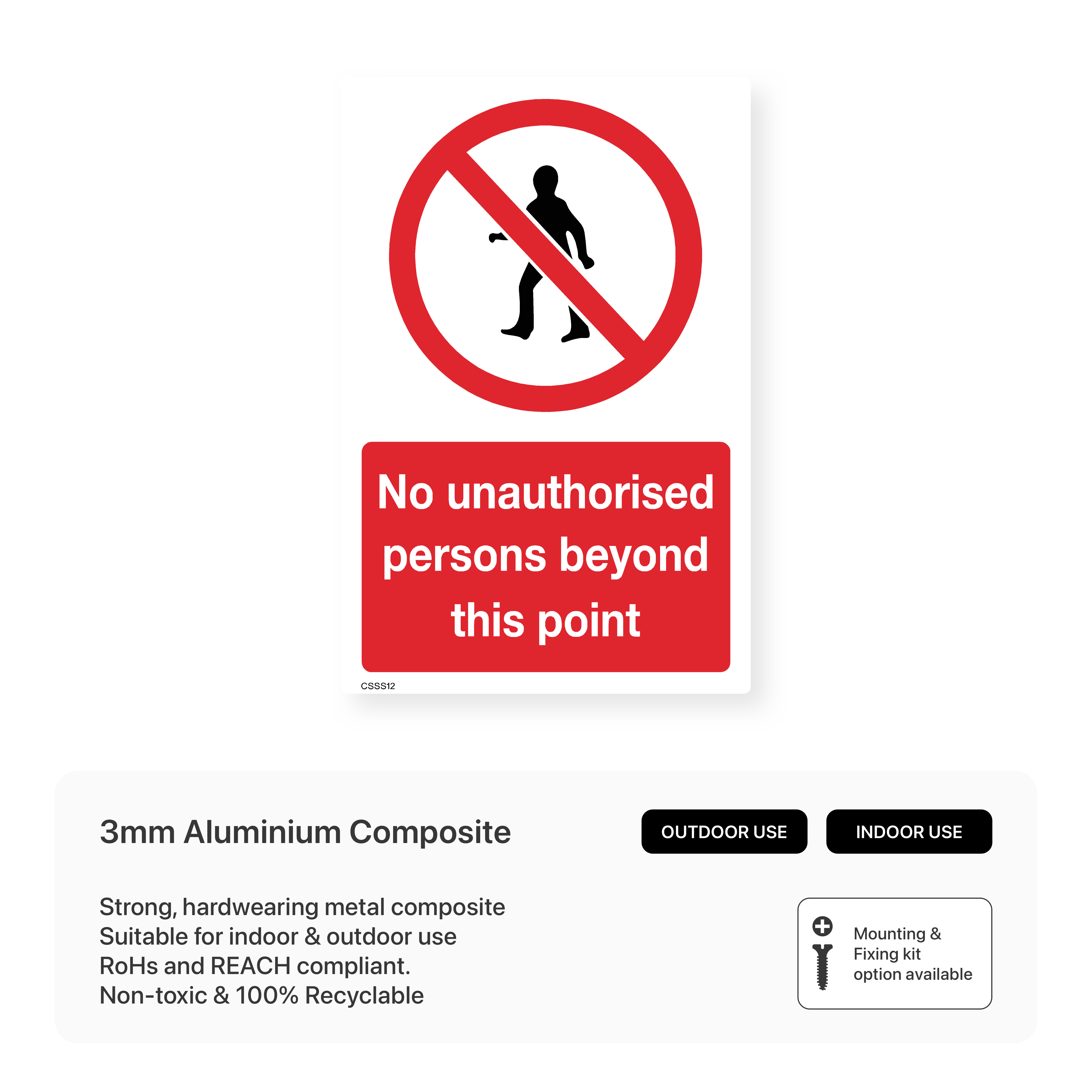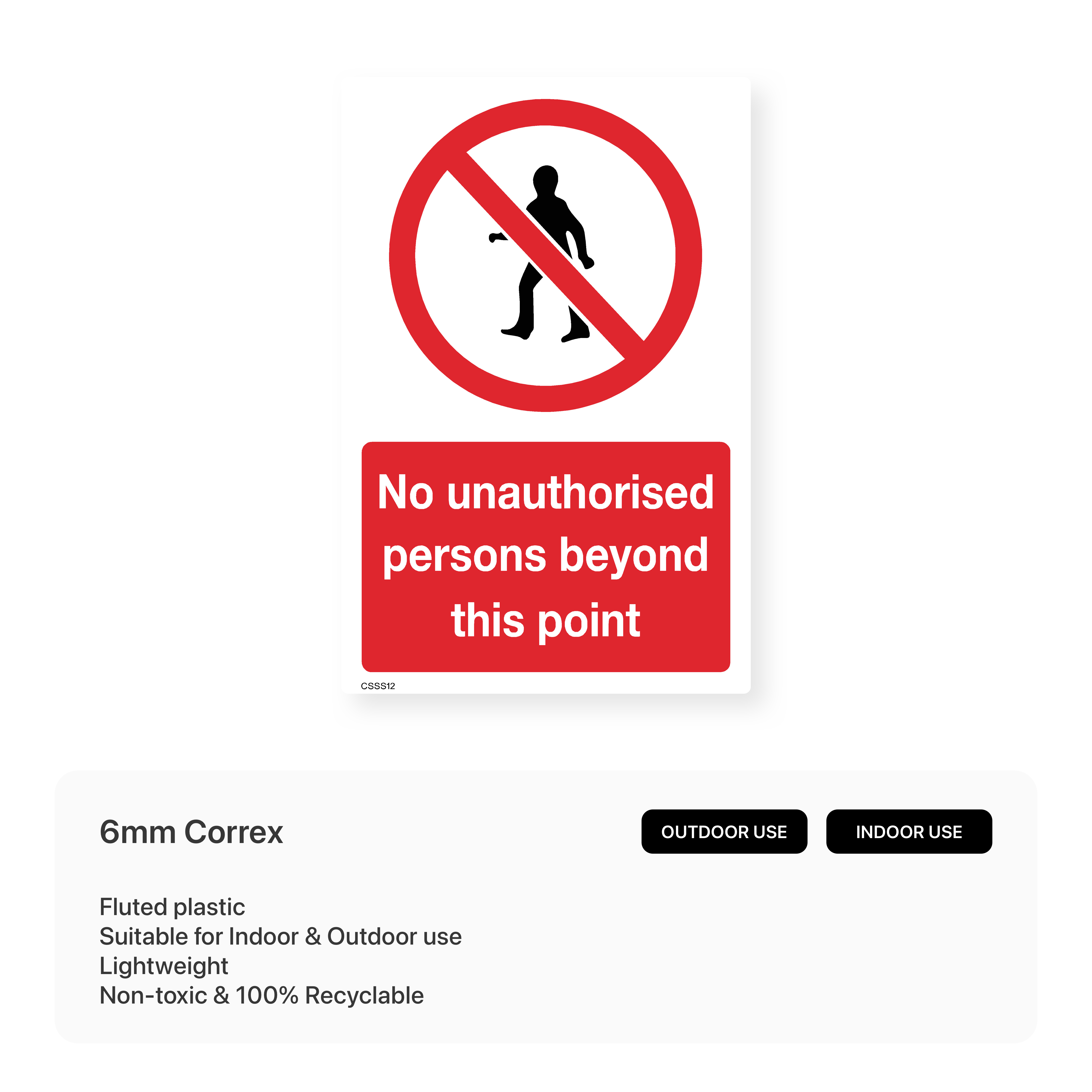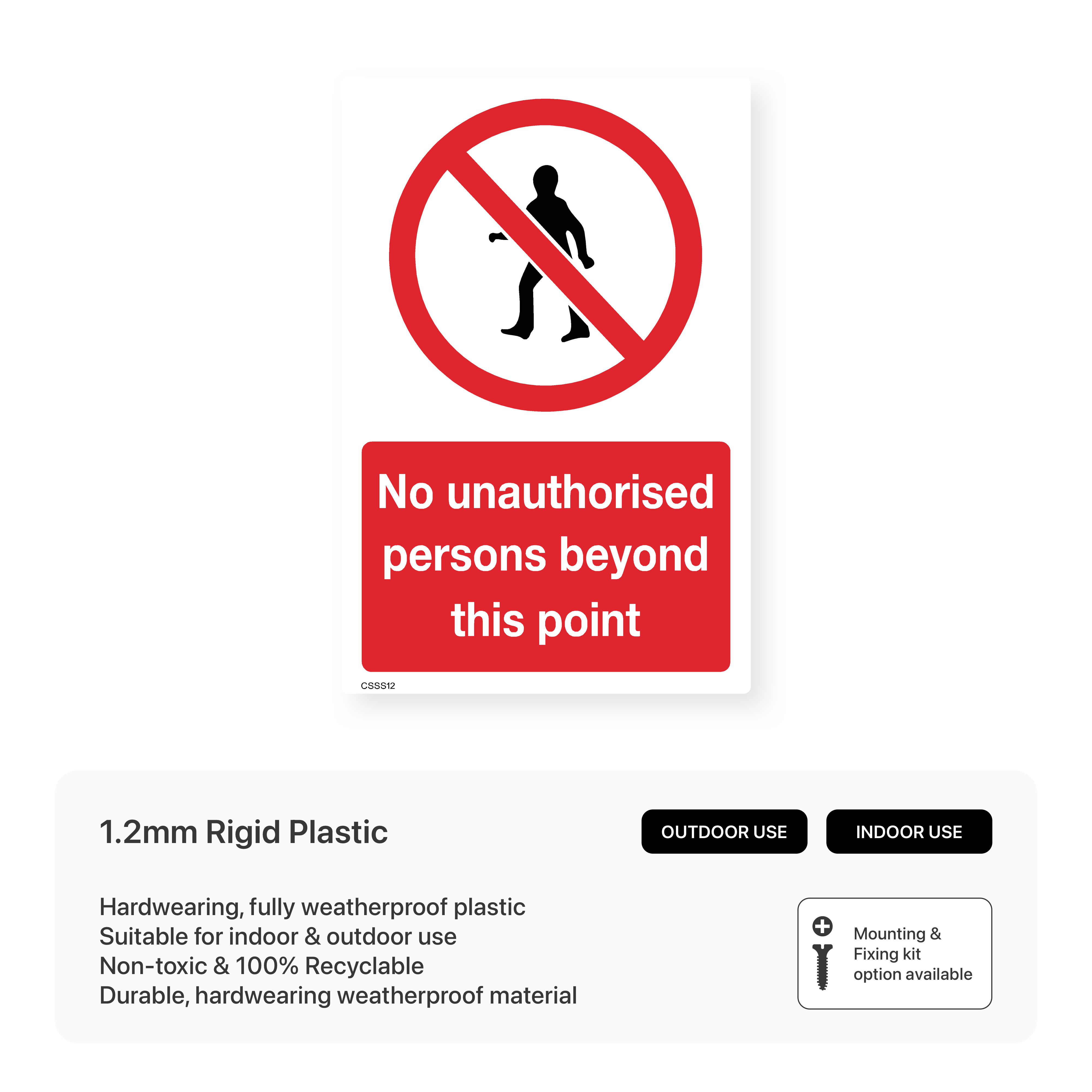 Restrict access to specific areas of your construction site with our "No unauthorised persons beyond this point" sign. This sign clearly communicates the restriction, preventing unauthorised entry and ensuring the safety and security of restricted zones.