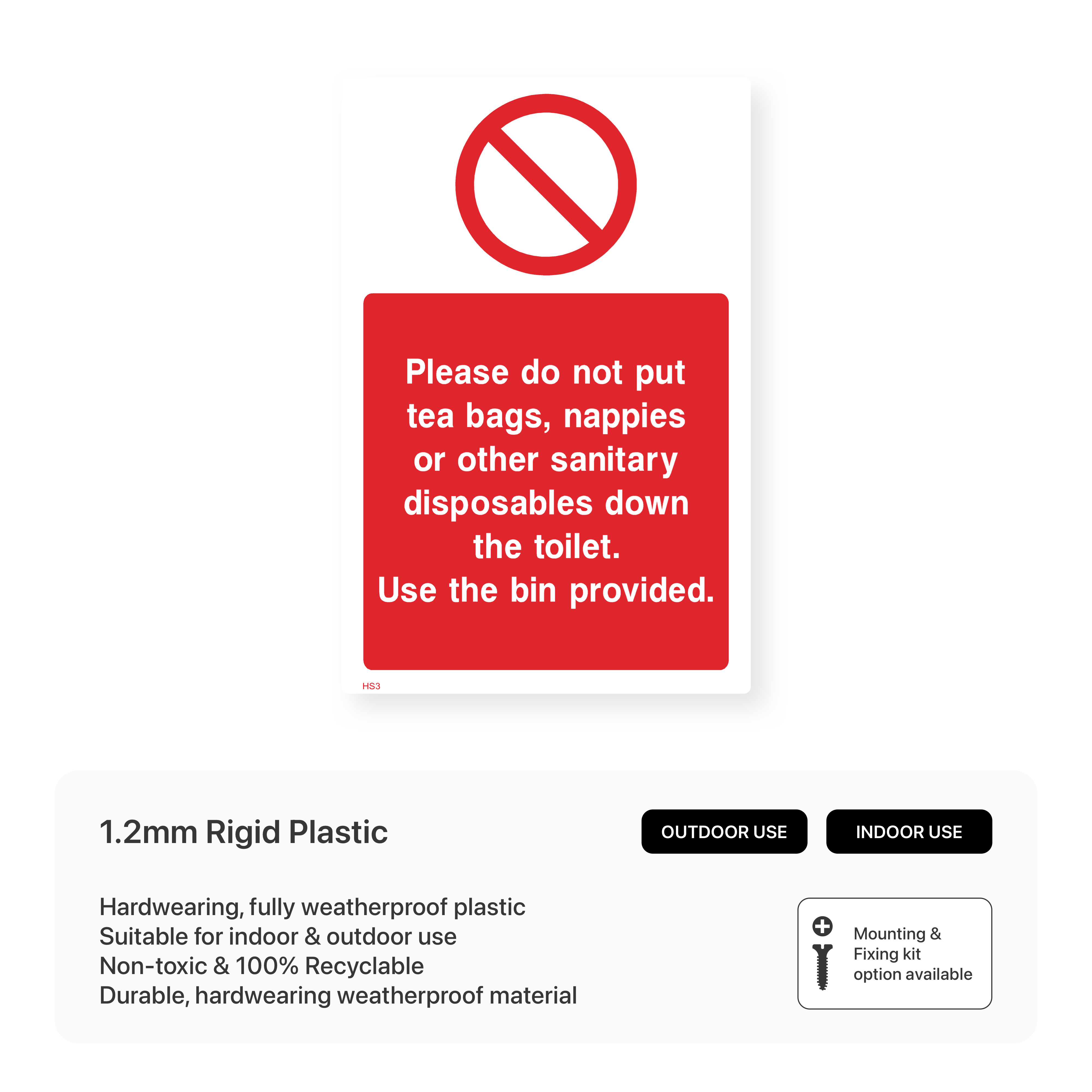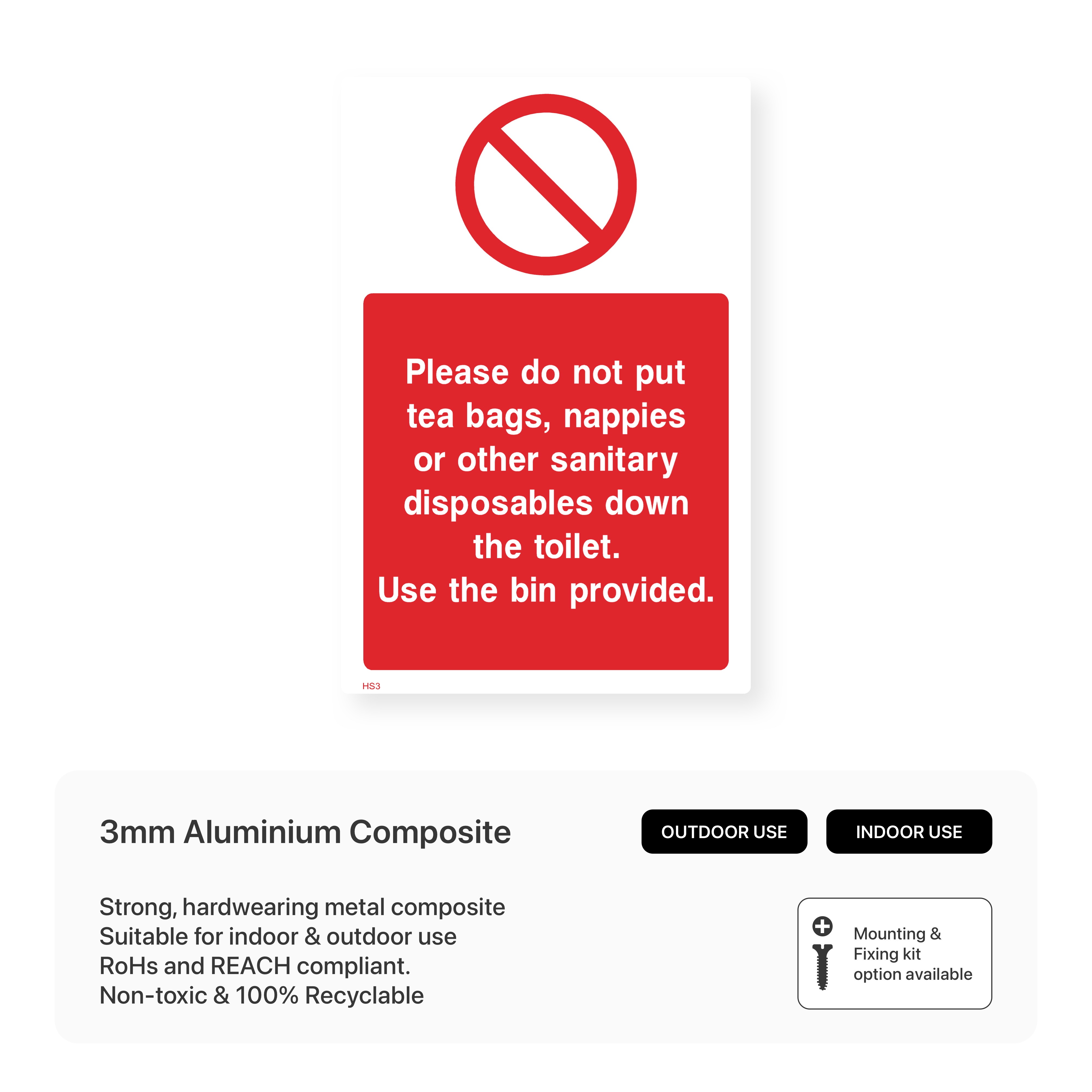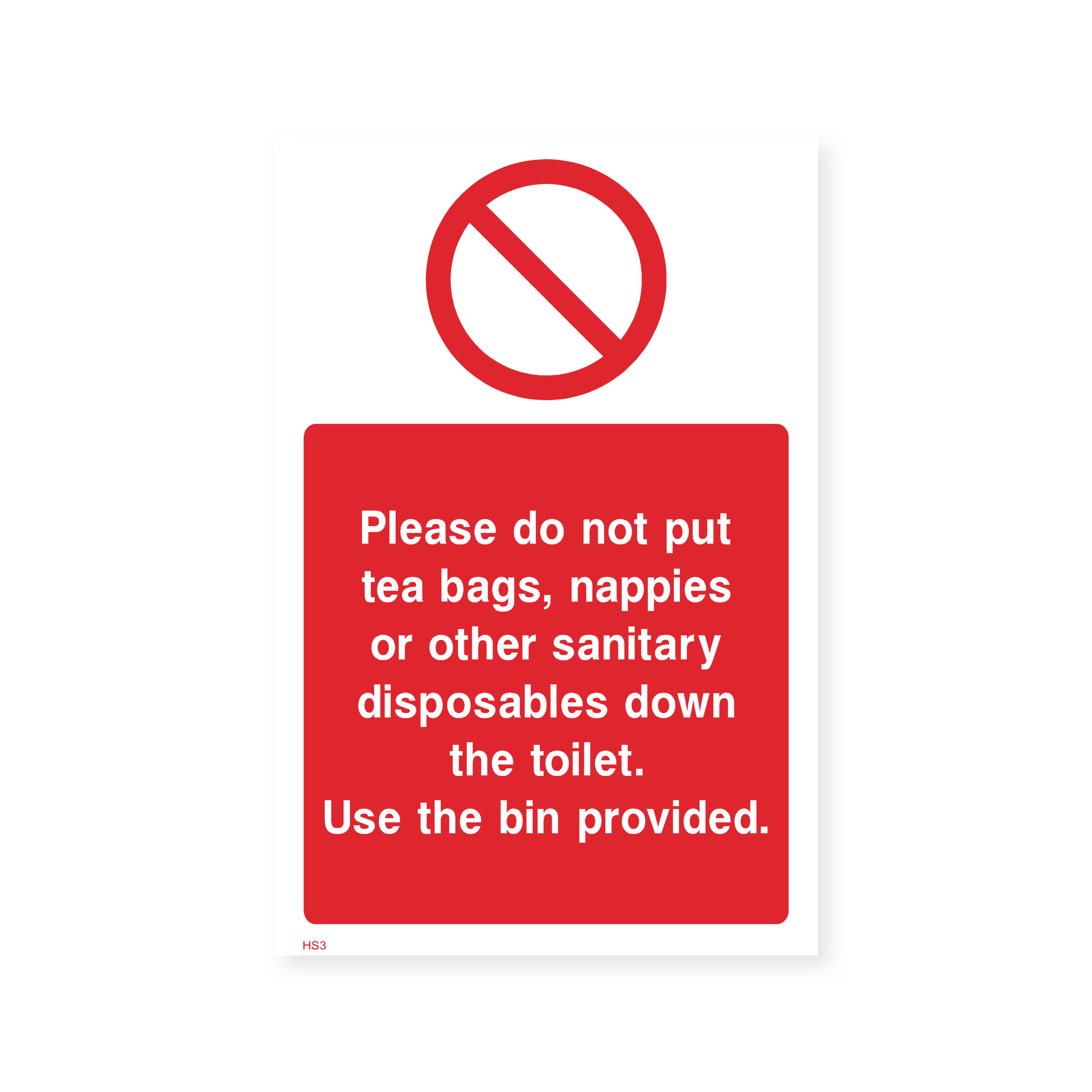 Keep your bathroom plumbing in top condition with our "Please do not put tea bags, nappies..." sign. This sign reminds guests to dispose of sanitary items responsibly, preventing clogs and ensuring a pleasant stay for everyone.