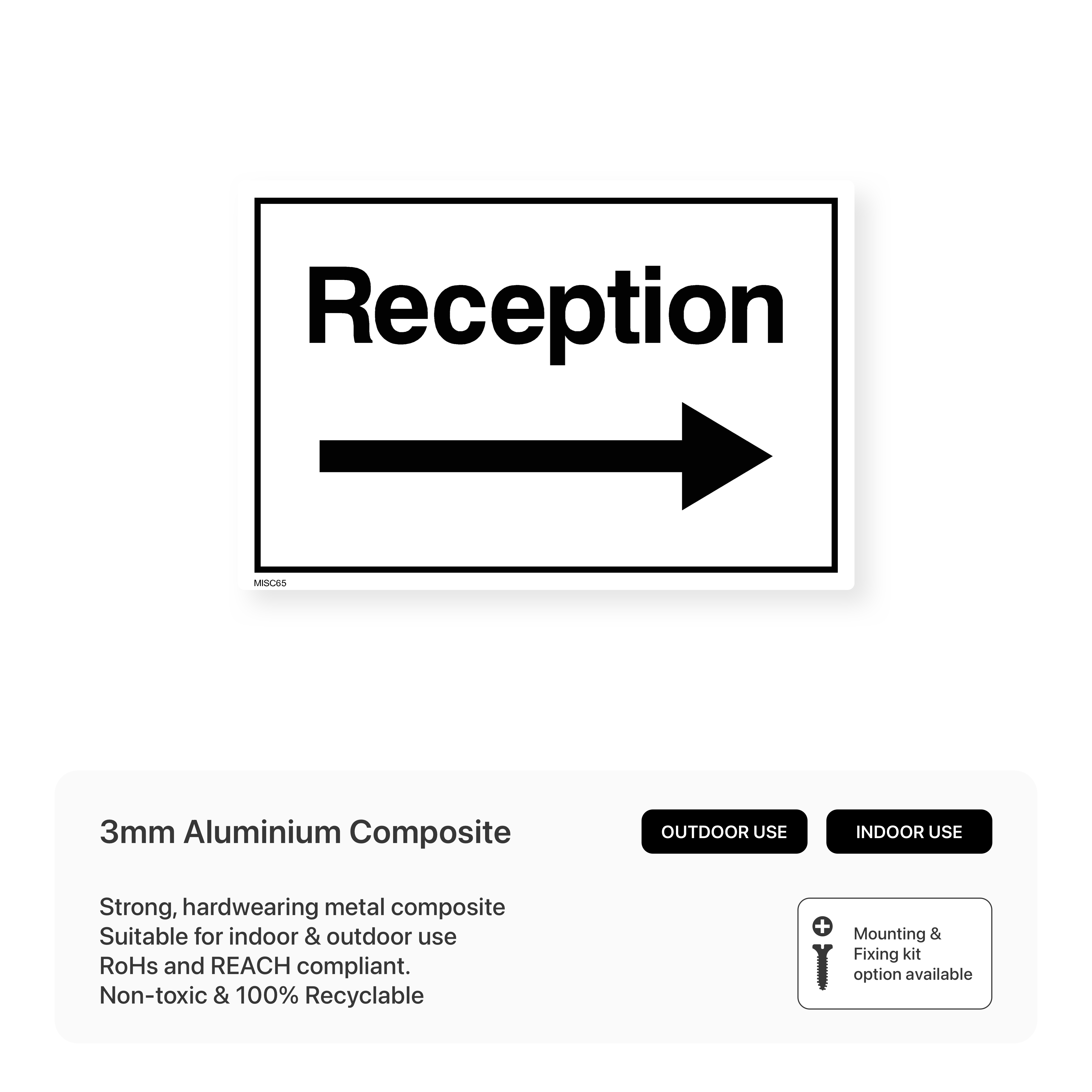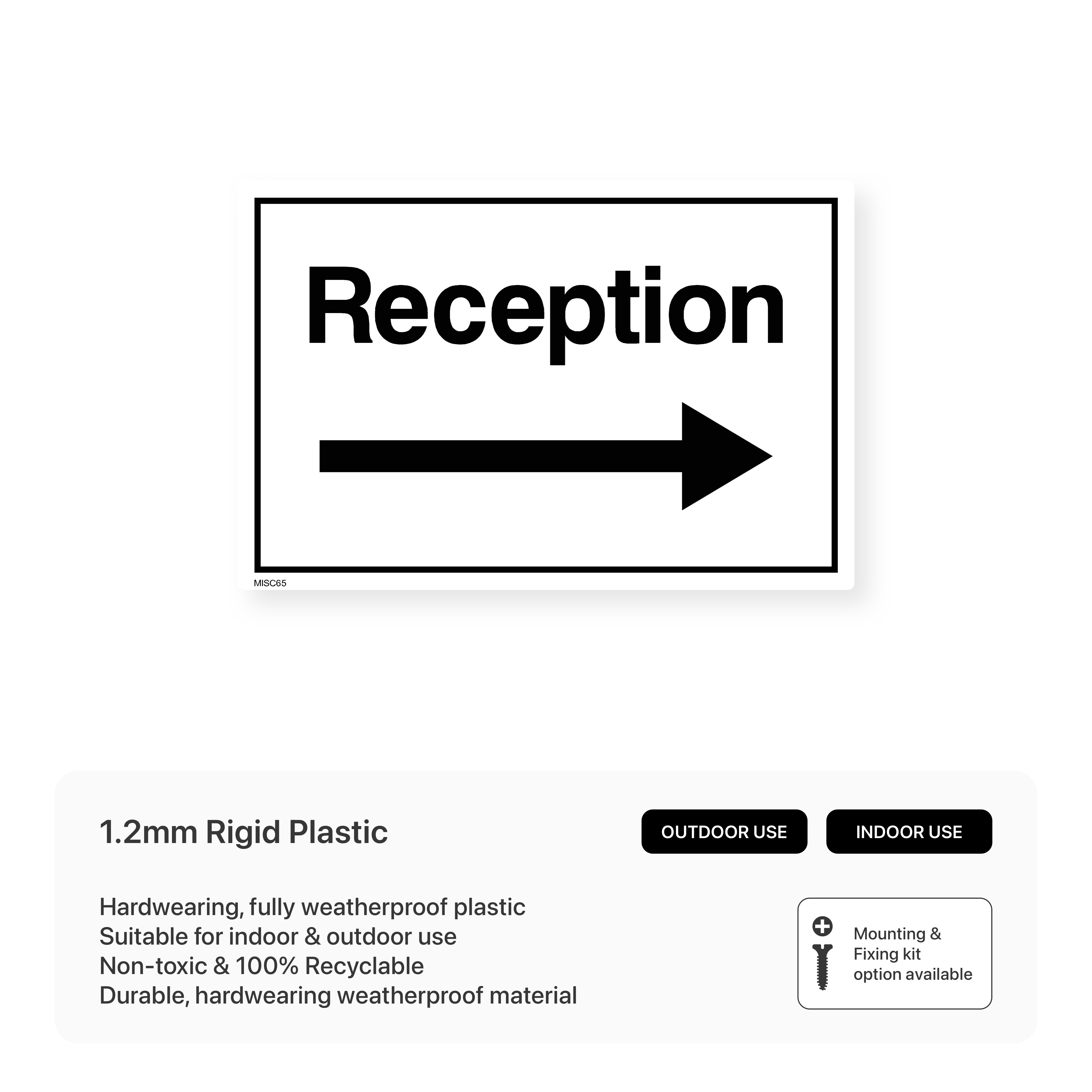 Guide visitors to your reception area with clear and concise signage. Our "Reception" signs with right arrows help ensure smooth navigation and a positive visitor experience. Available in various sizes and materials.