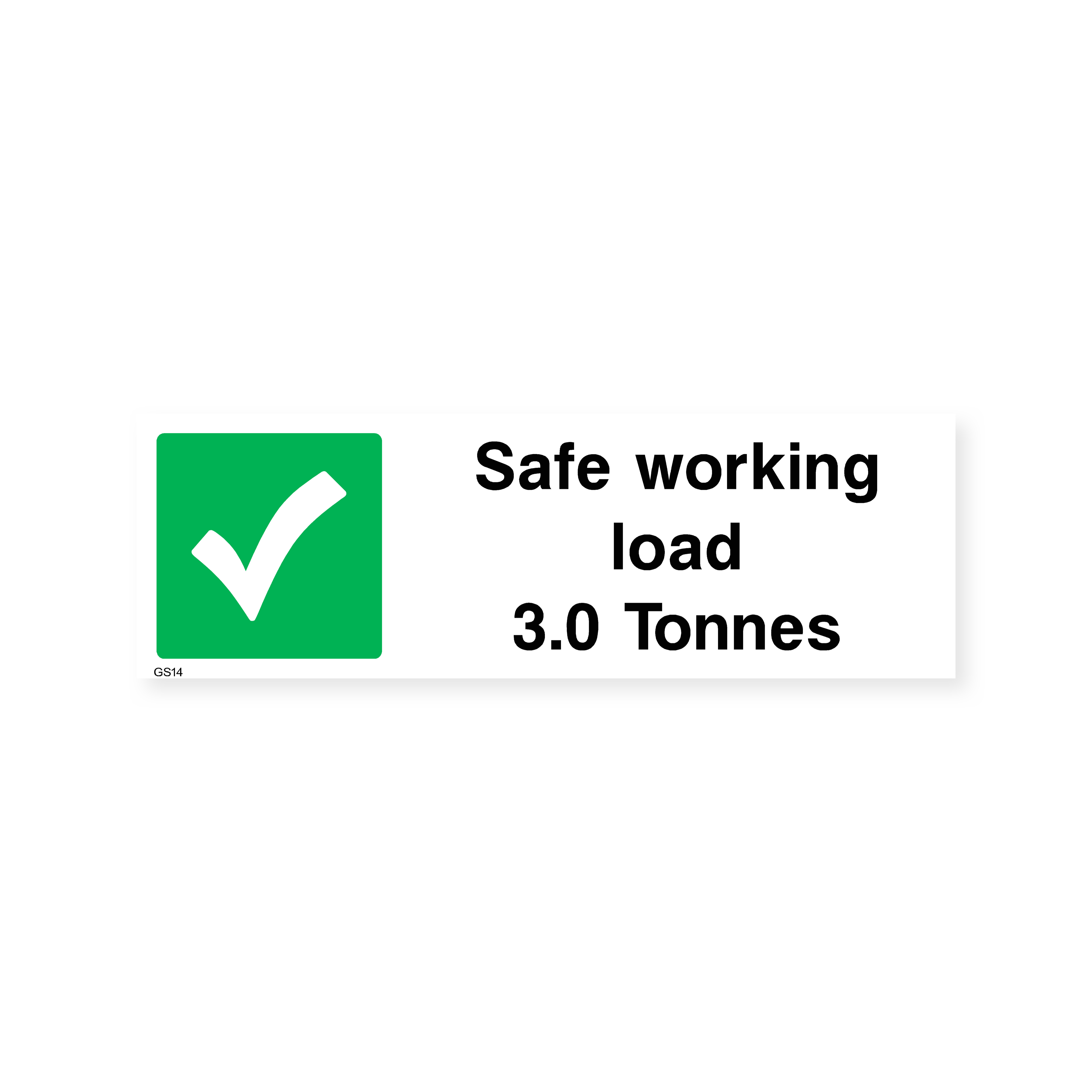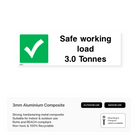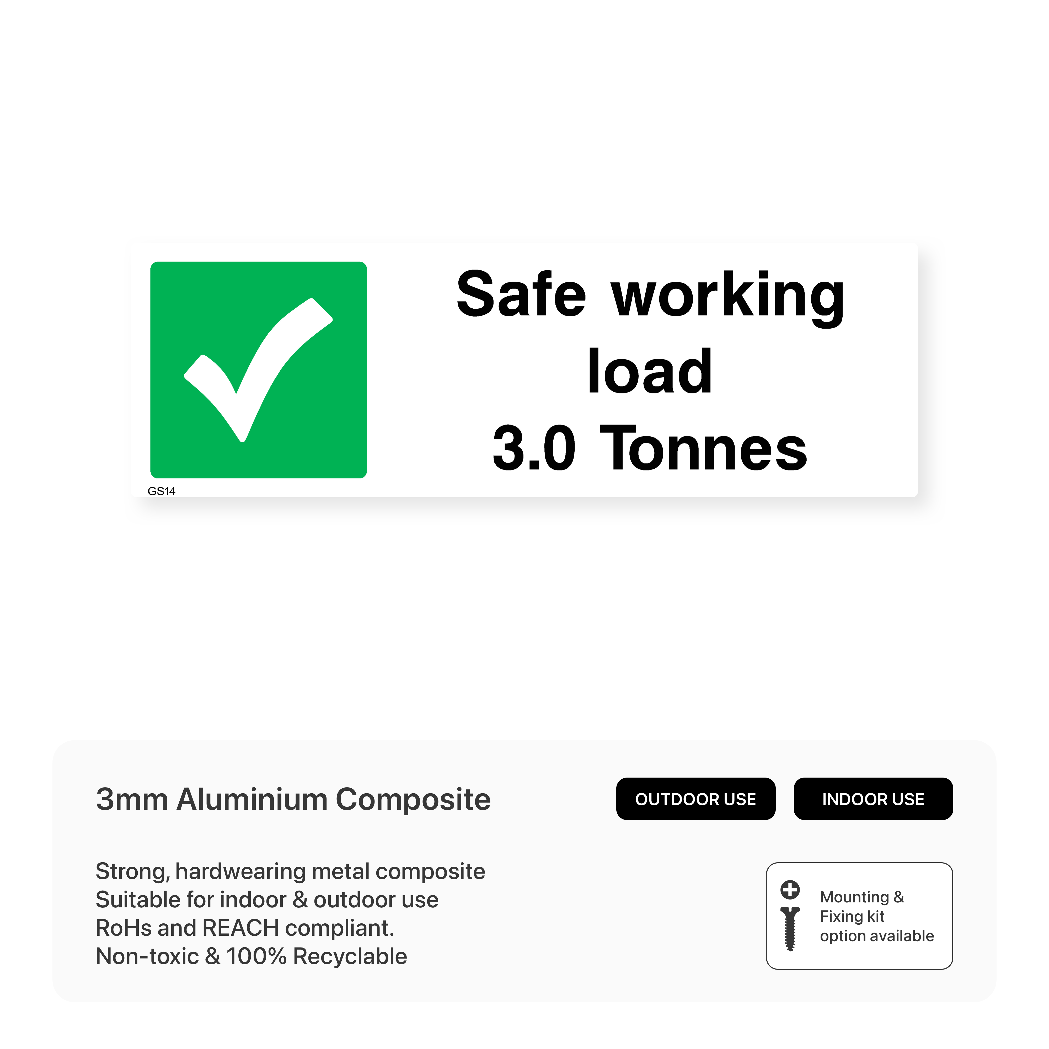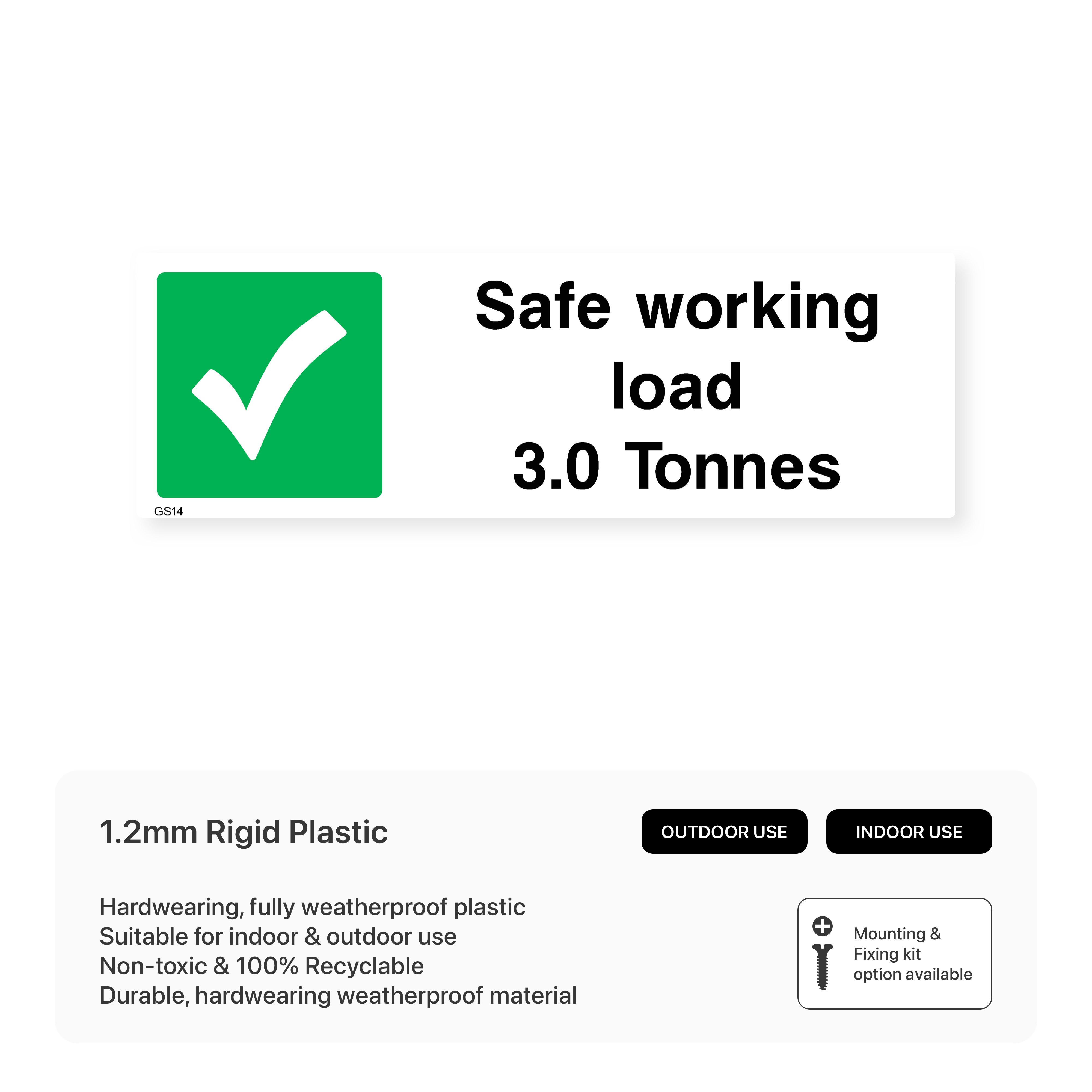 Ensure safety in your garage with our "Safe working load - 3.0 tonnes" sign. This sign clearly indicates the maximum weight capacity of a specific area or equipment, preventing overloading and accidents.