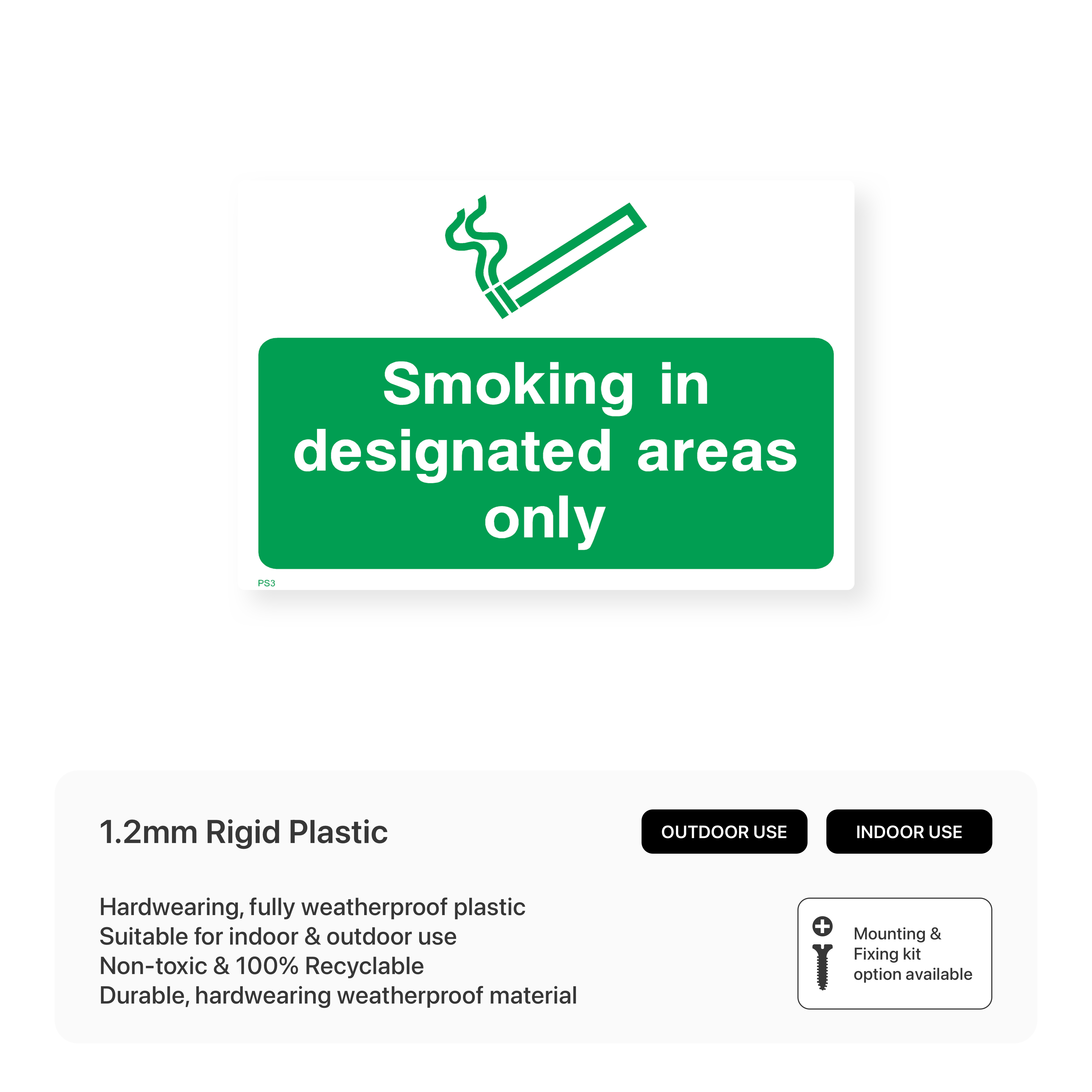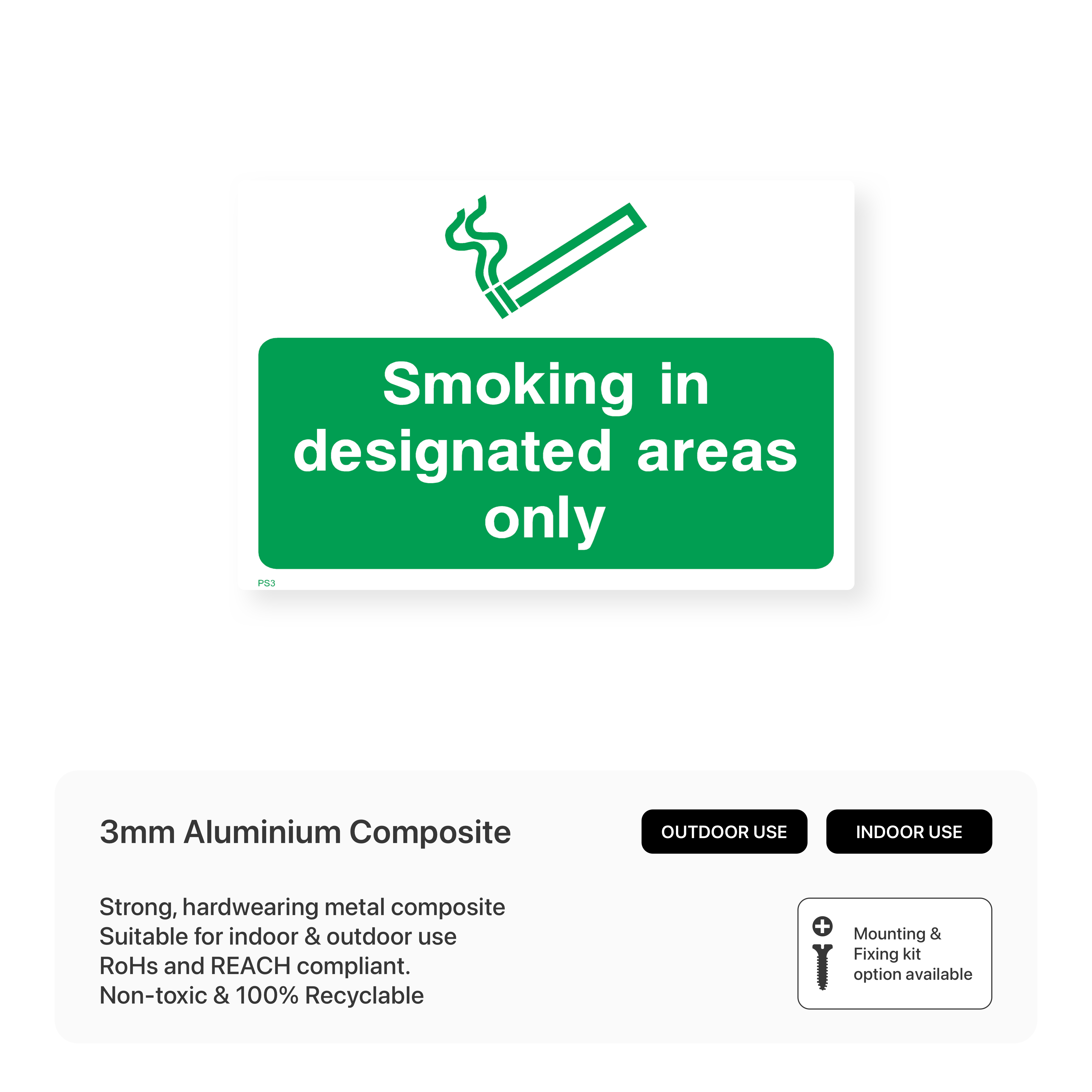 Encourage responsible smoking habits with this "Smoking in Designated Areas Only" sign. This sign helps prevent smoking in restricted areas and promotes a clean and healthy environment for all. Maintain a safe and compliant environment while accommodating the needs of smokers.