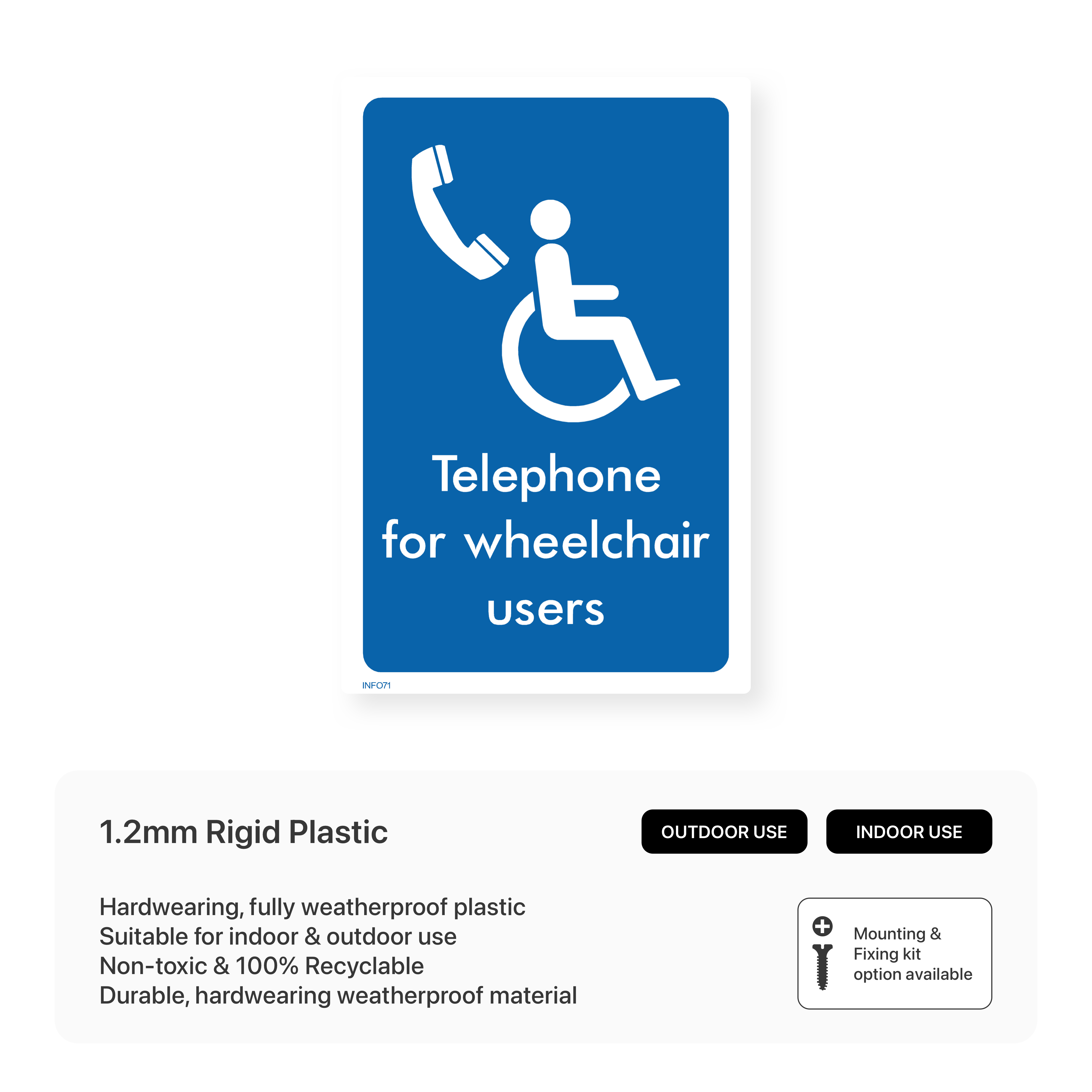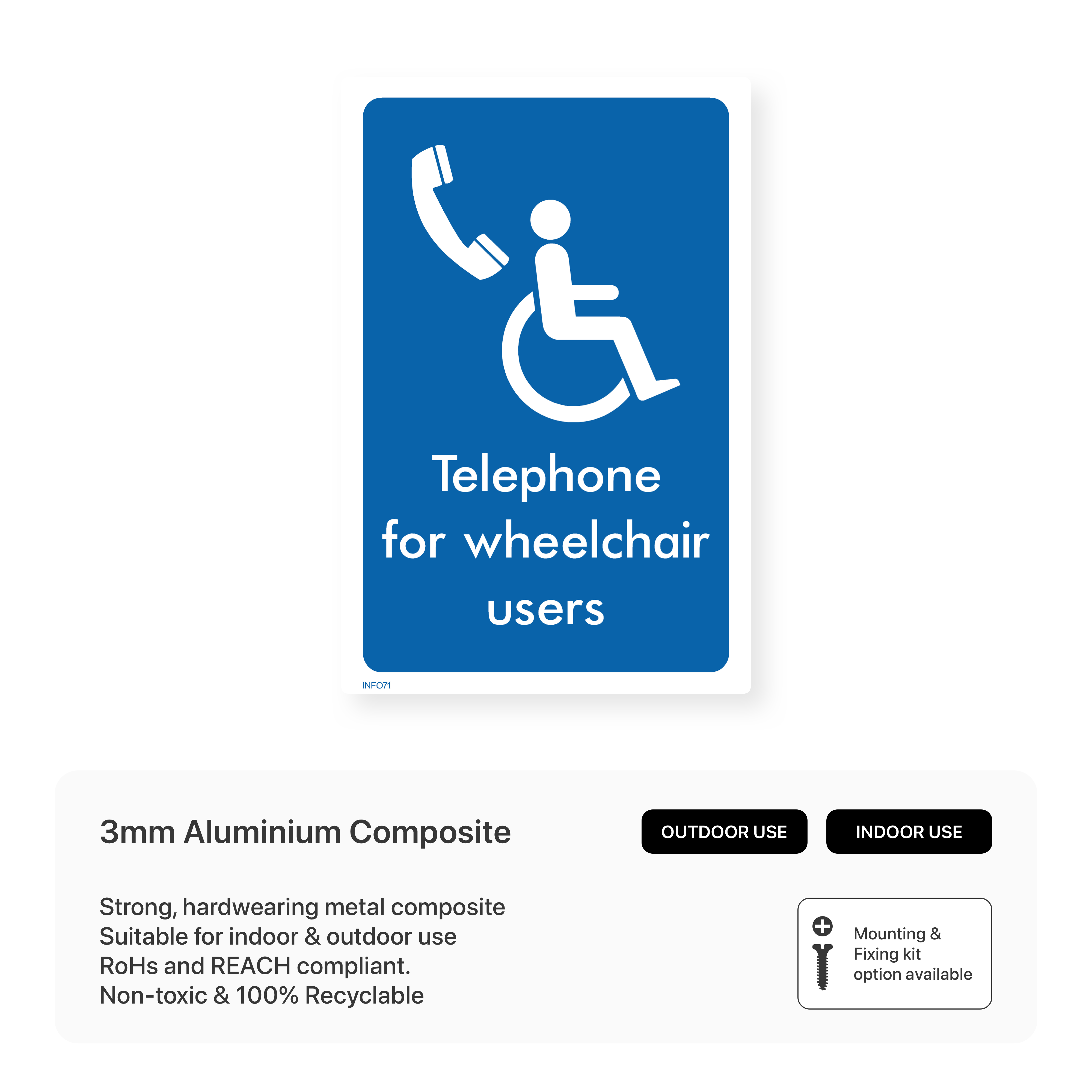 Ensure accessibility for wheelchair users with our "Telephone for wheelchair users" sign. This sign clearly marks the location of telephones that are specifically designed to be accessible for wheelchair users, promoting inclusivity and equal access.