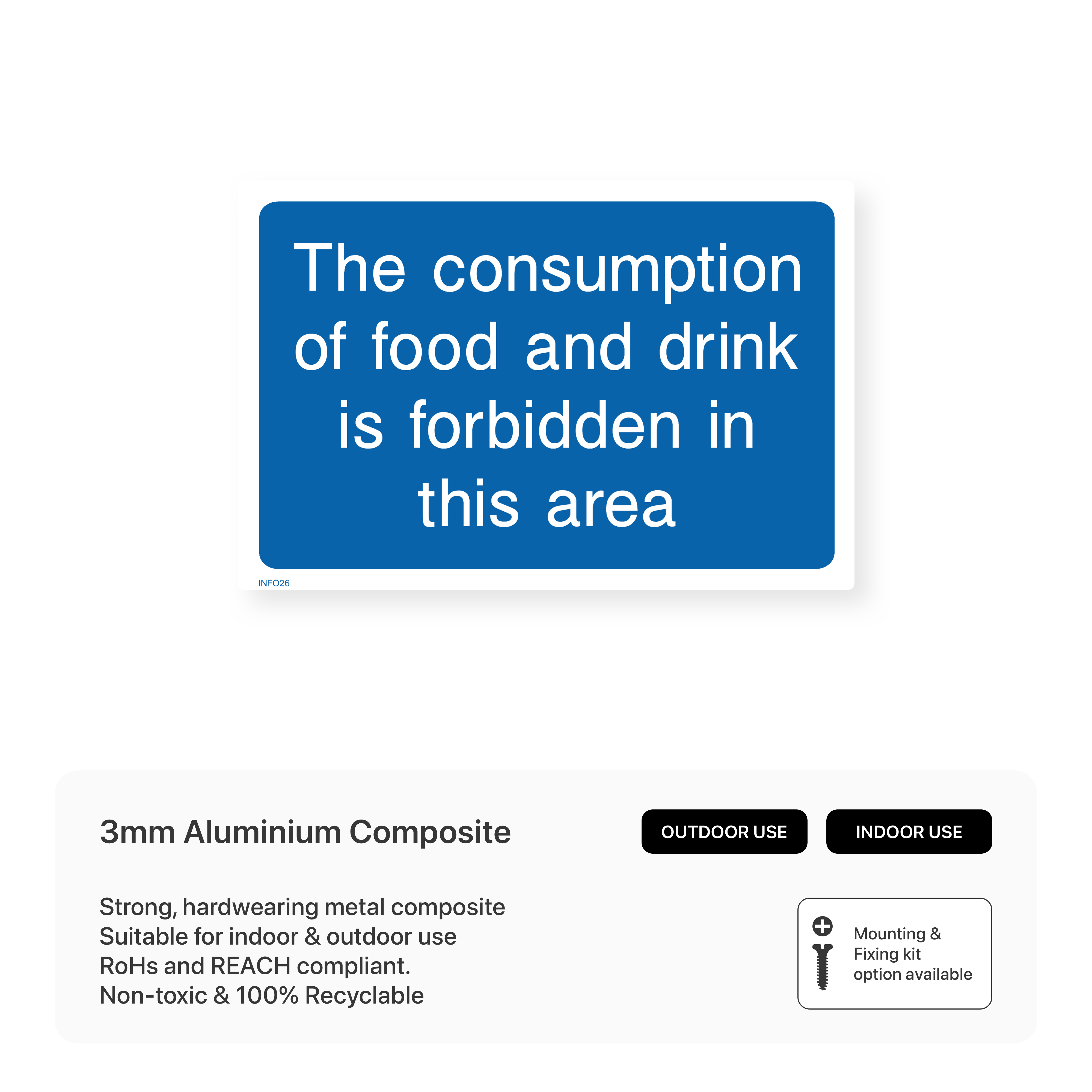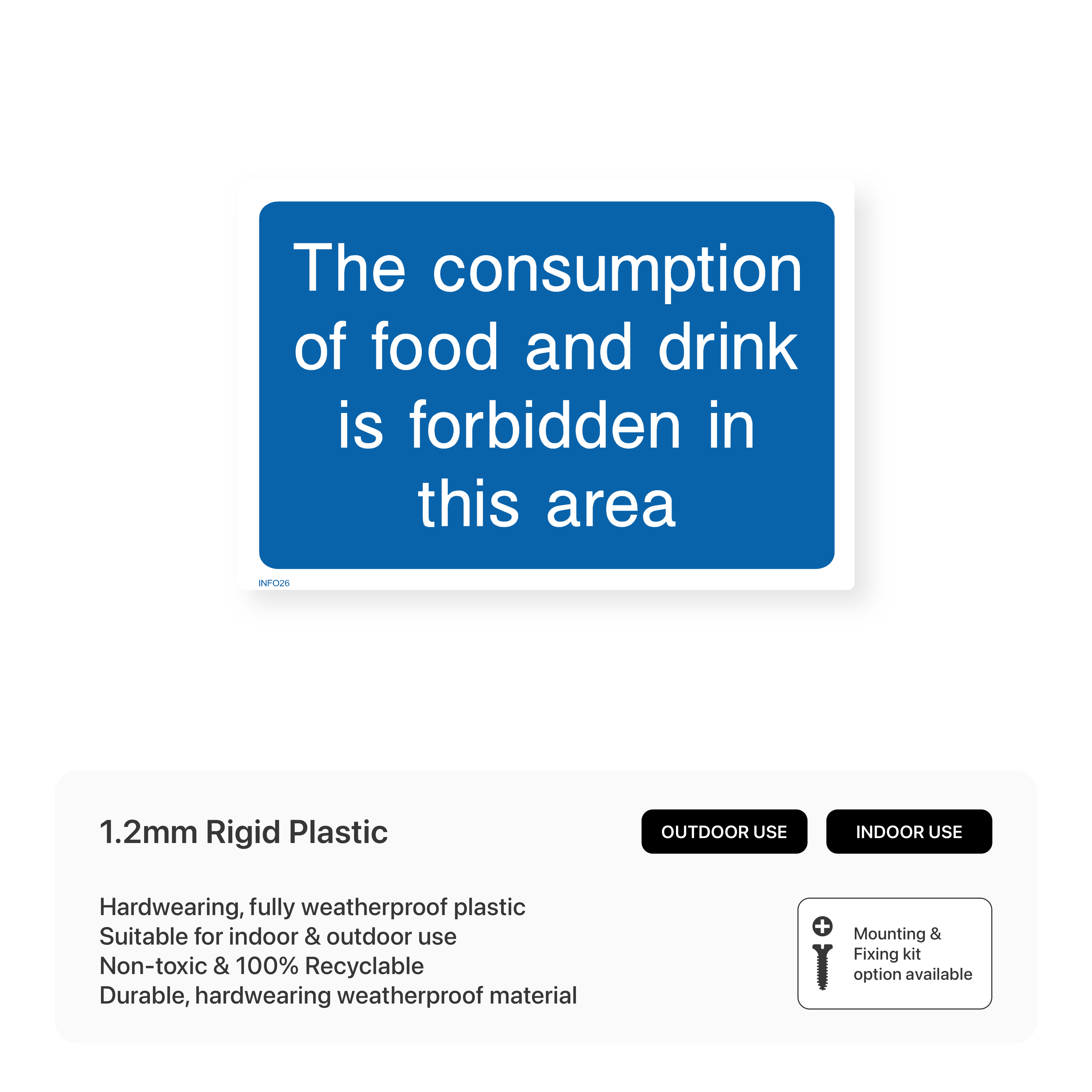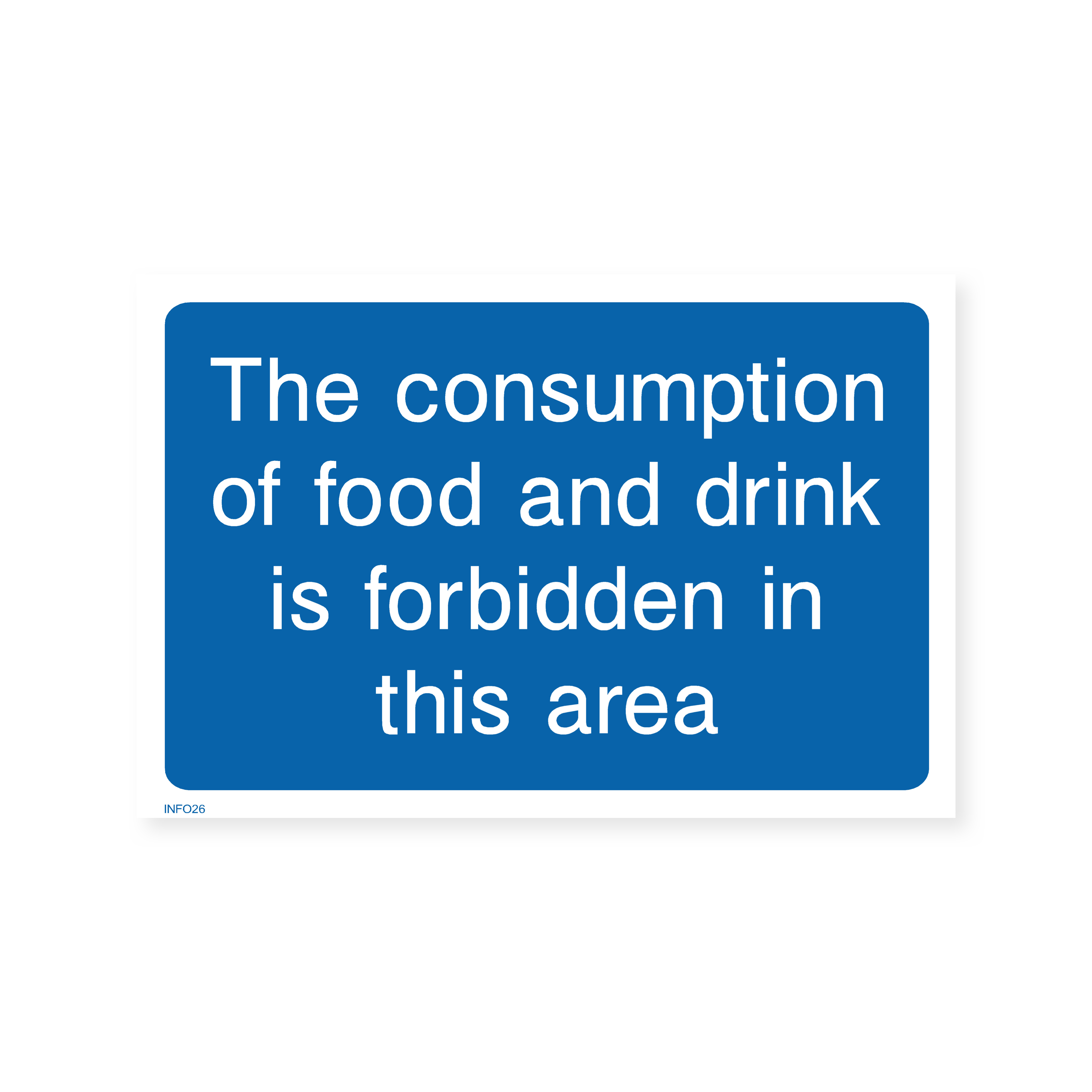 Maintain cleanliness and hygiene with our "The consumption of food and drink is forbidden in this area" sign. This sign clearly prohibits eating and drinking in designated areas, preventing spills and maintaining a clean environment.