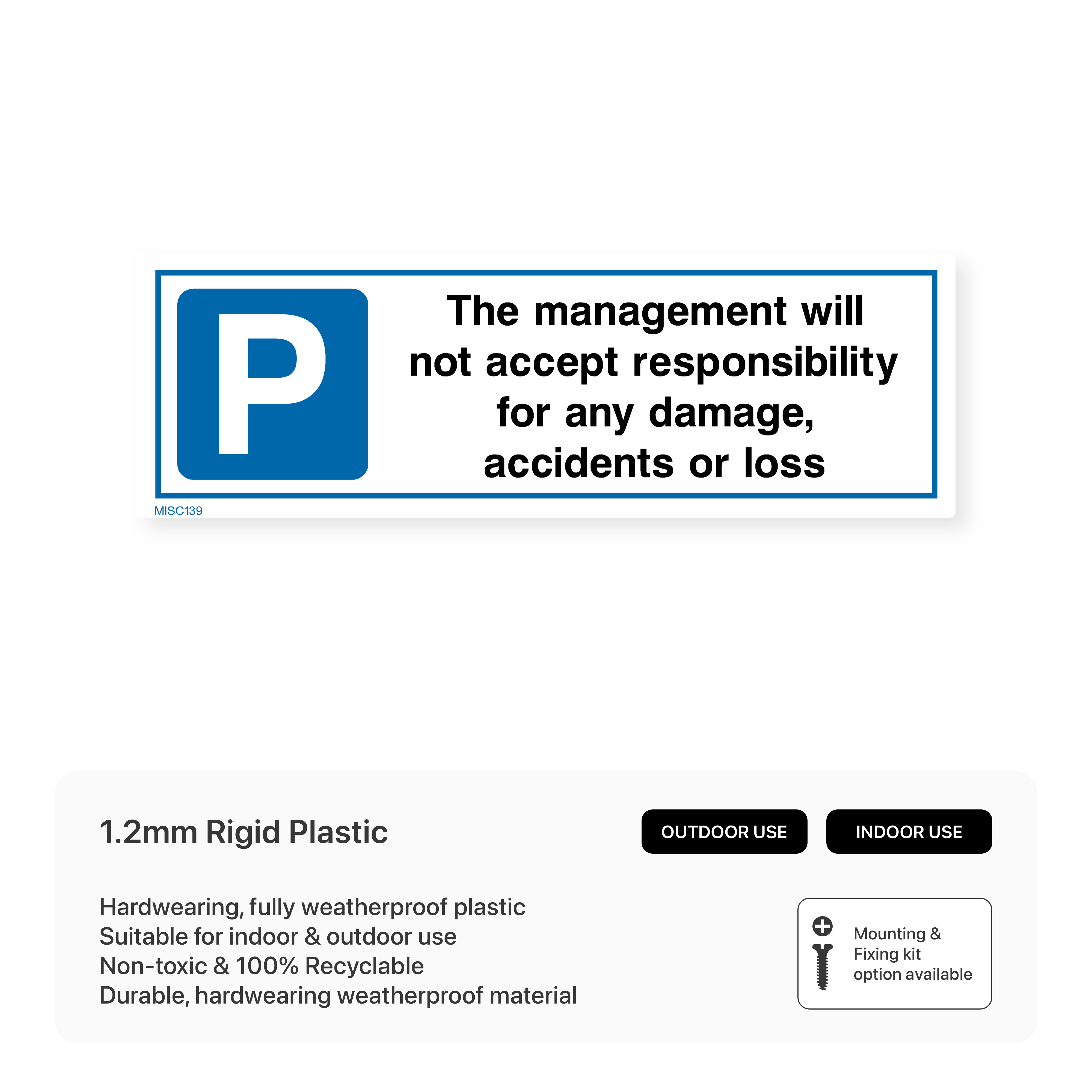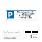 Inform drivers of parking conditions with our "The Management Will Not Accept Responsibility" sign. Clearly communicates no liability for damage, accidents, or loss in the car park.