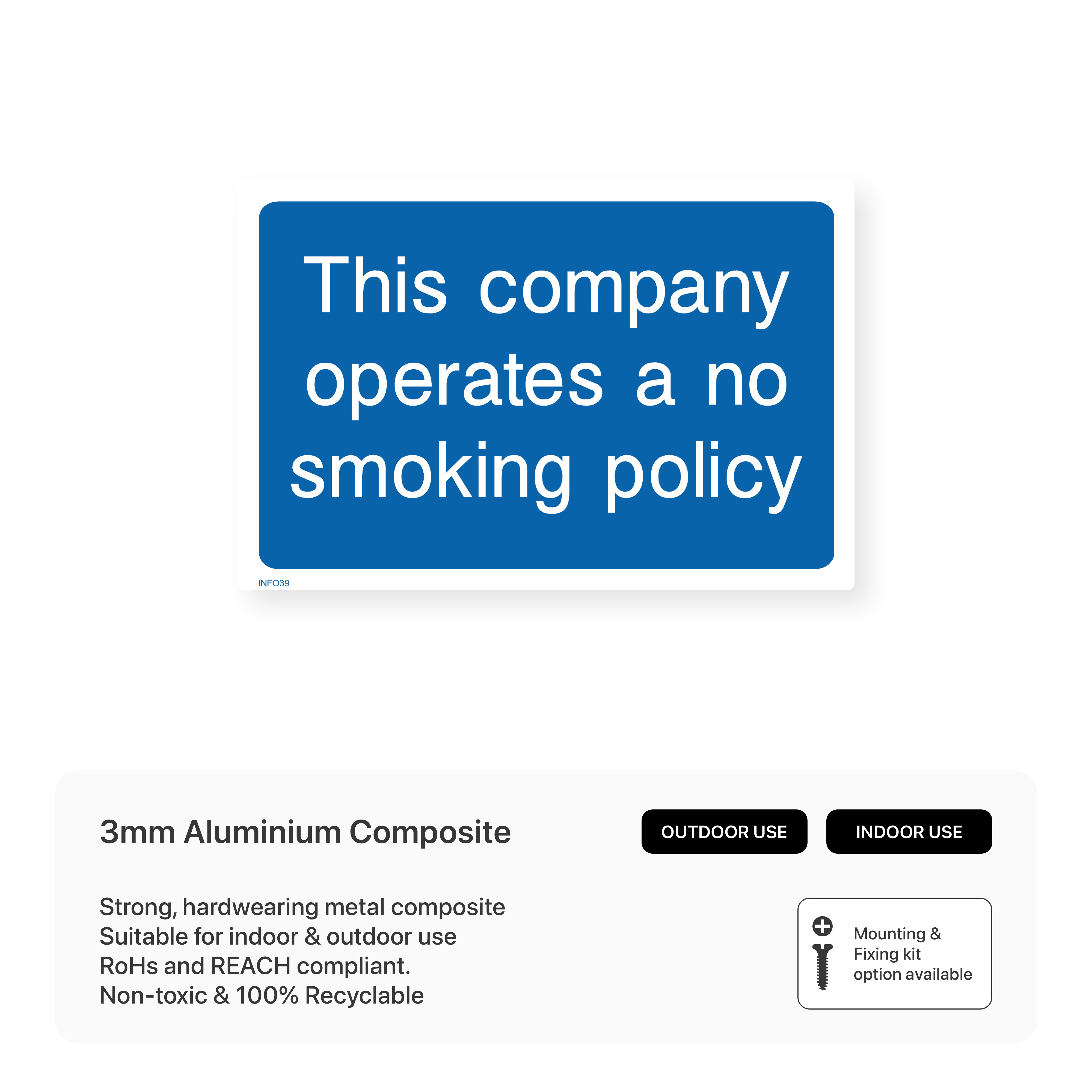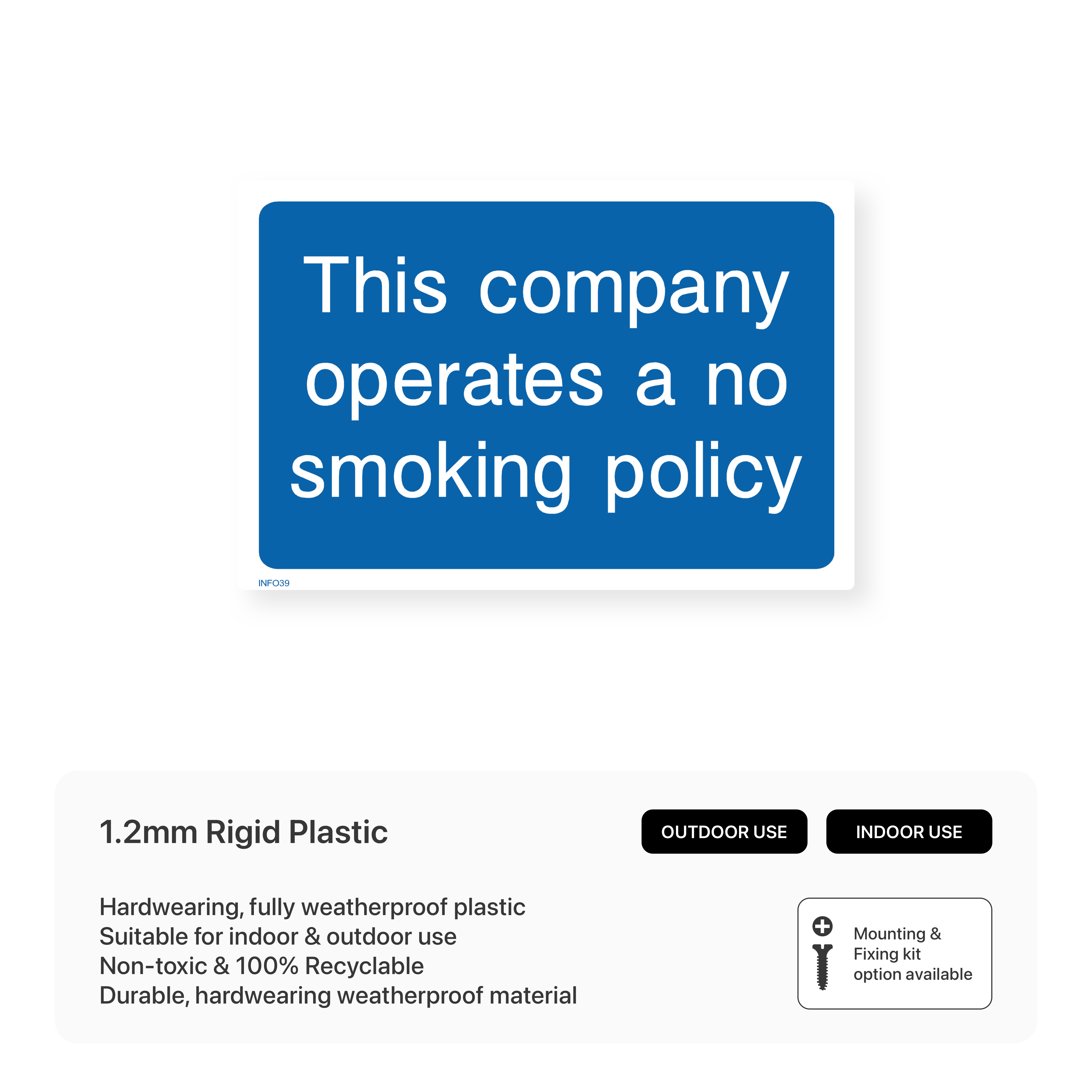 Promote a healthy and safe environment with our "This company operates a no smoking policy" sign. This sign clearly communicates the company's commitment to a smoke-free workplace, ensuring compliance with regulations and protecting the health of employees and visitors.