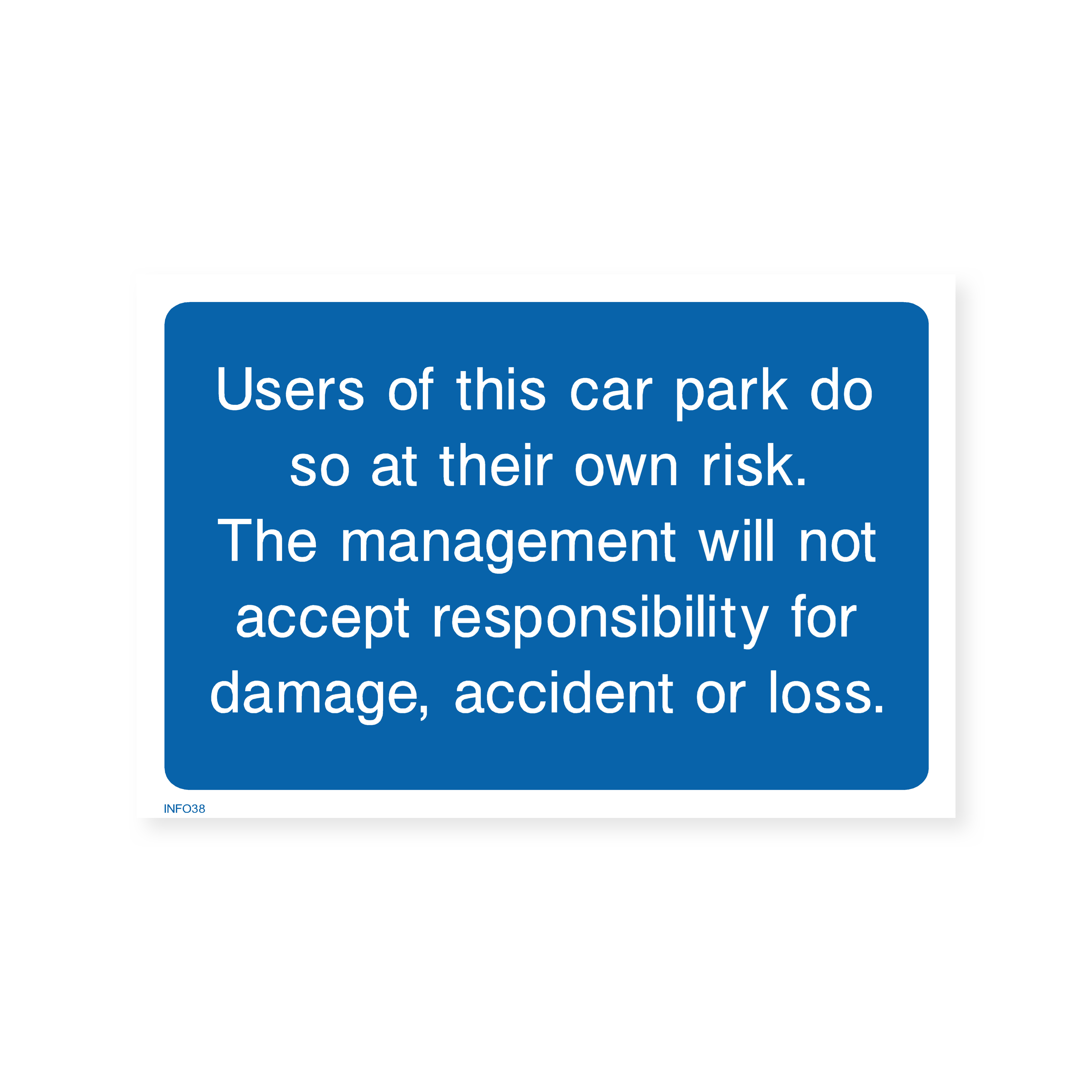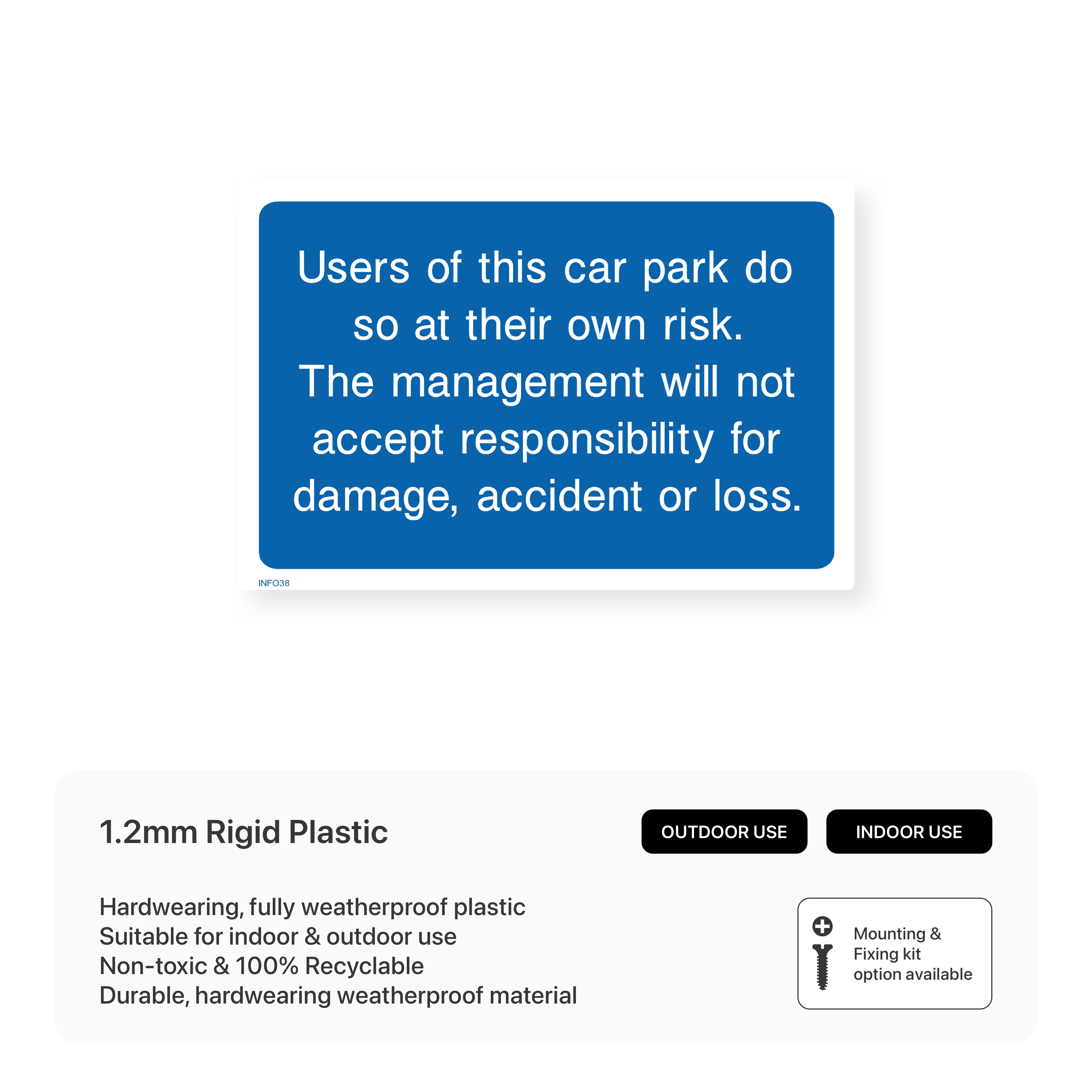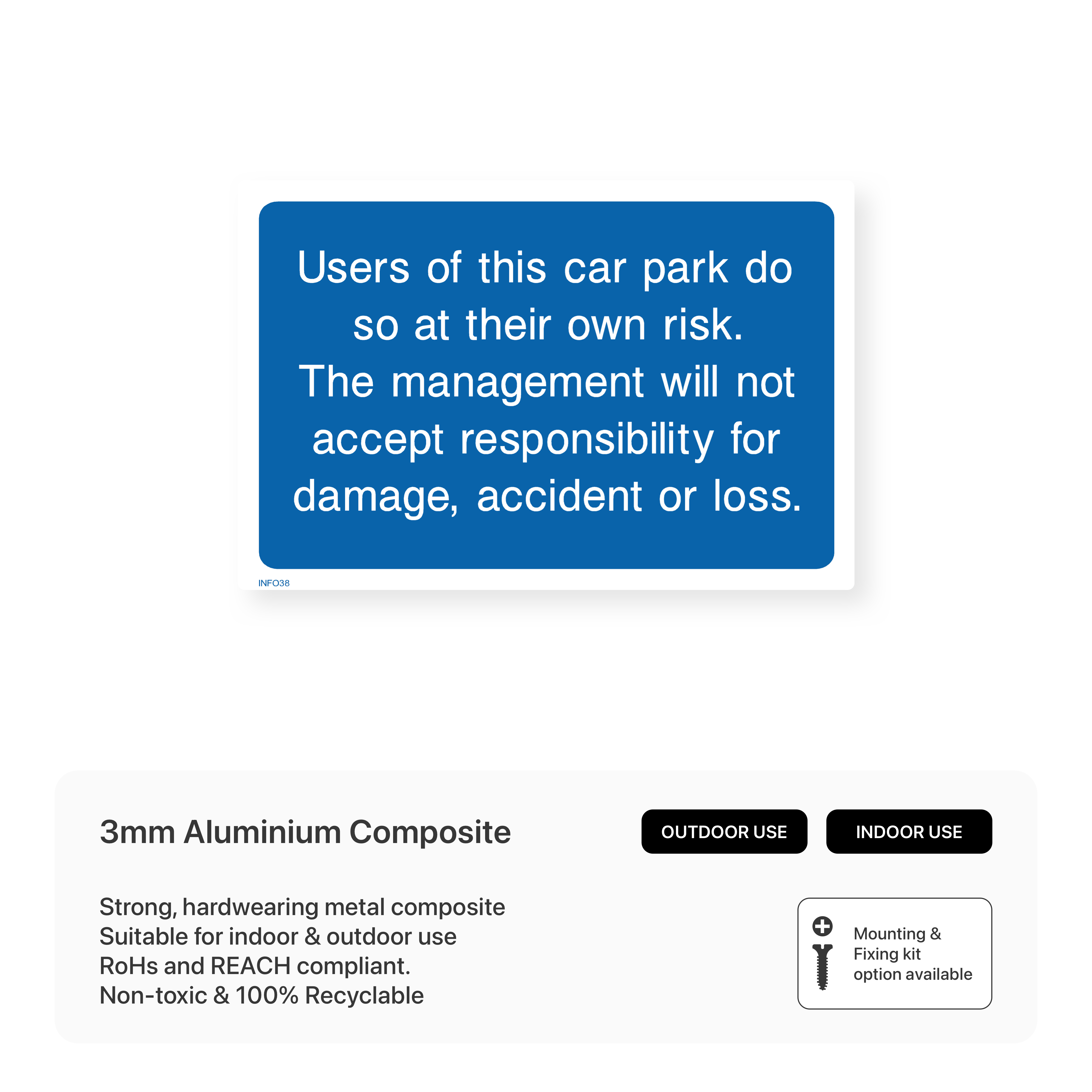 Inform users of parking policies with our "Users of this car park do so at their own risk" sign. This sign clearly states that the management is not liable for any loss or damage to vehicles or property in the car park, encouraging users to park responsibly.