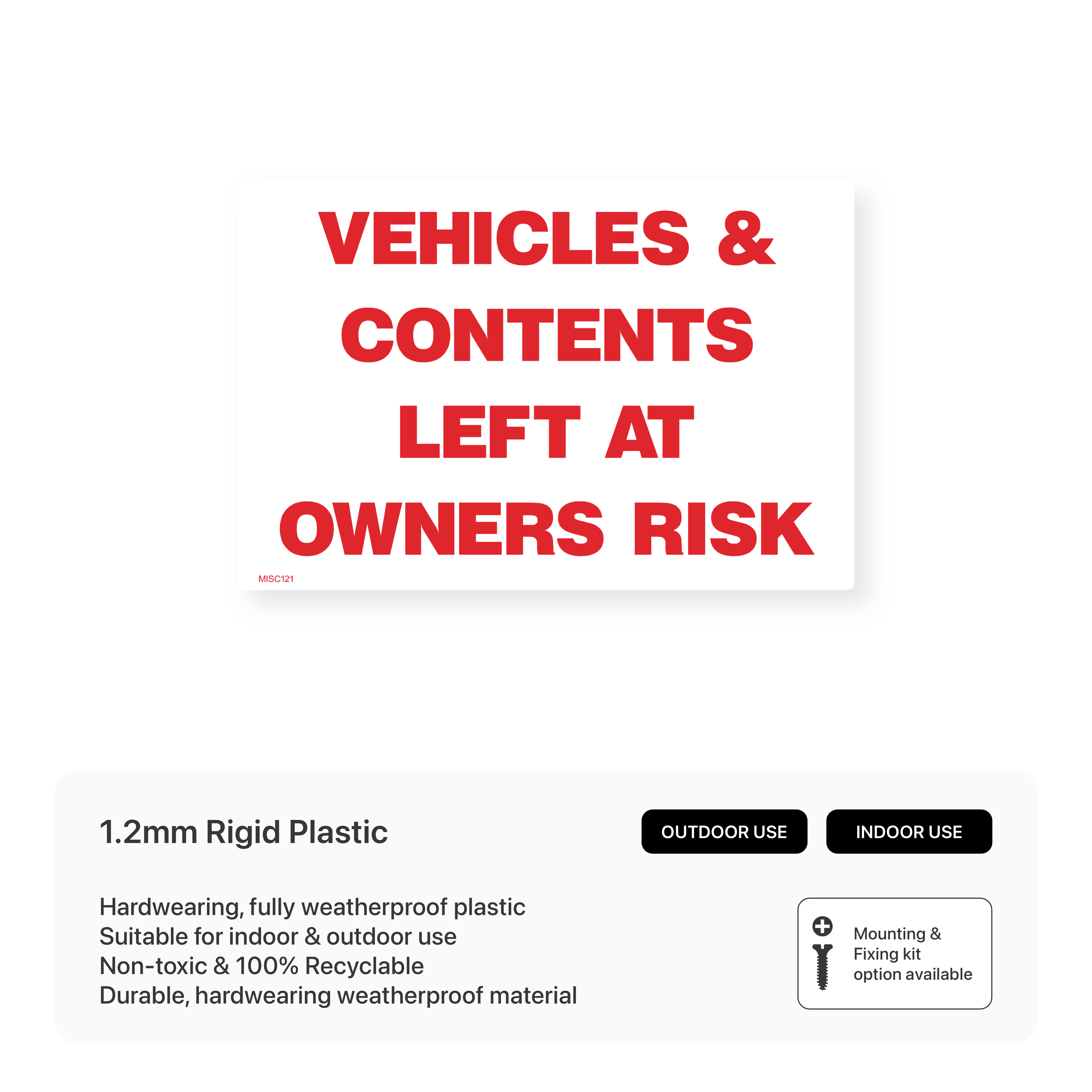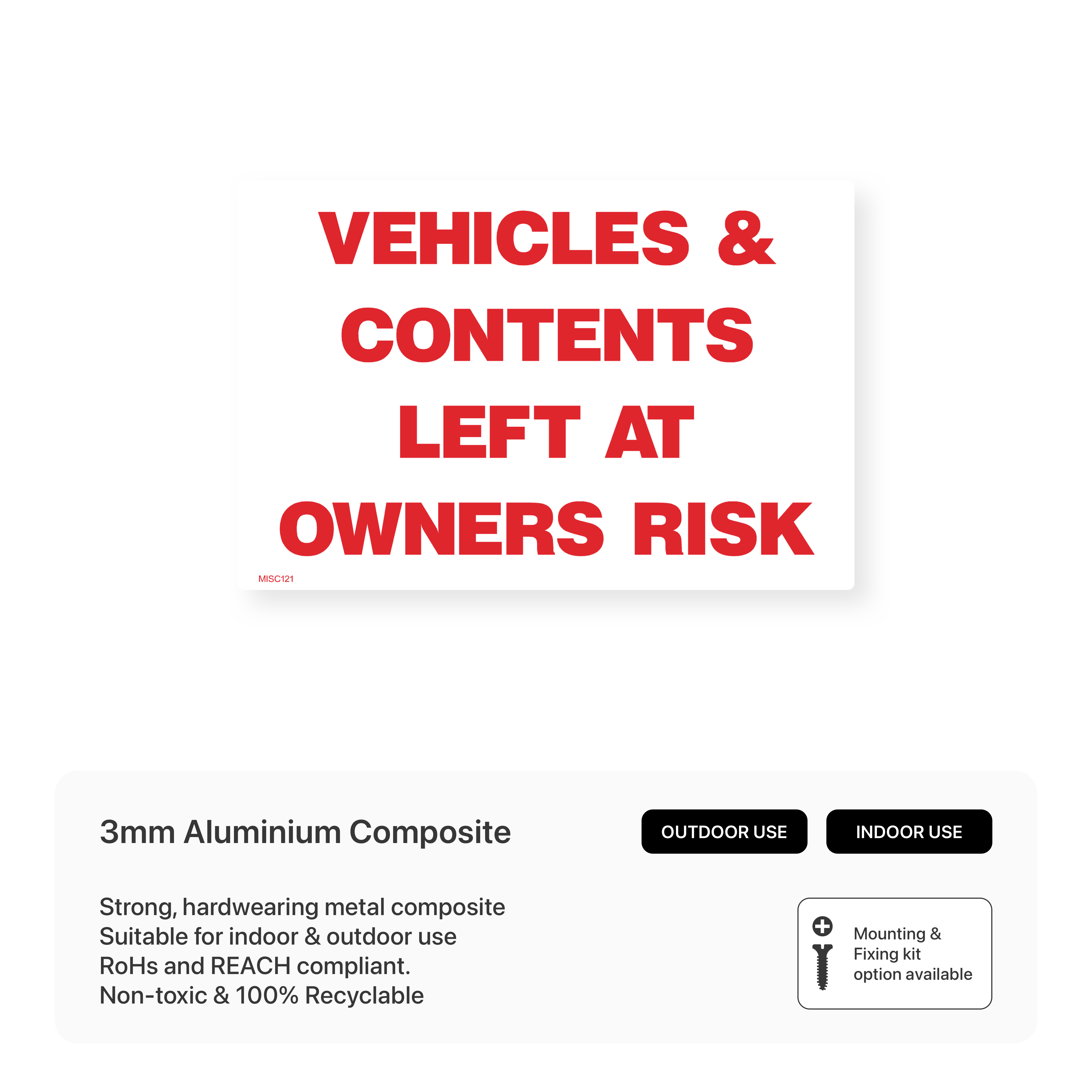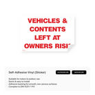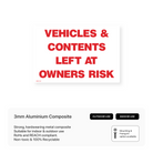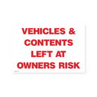 Inform drivers that they park at their own risk with our "Vehicles & Contents Left at Owner's Risk" signs. Clearly communicate that the management is not responsible for any loss or damage to vehicles or belongings. Available in various sizes and materials.