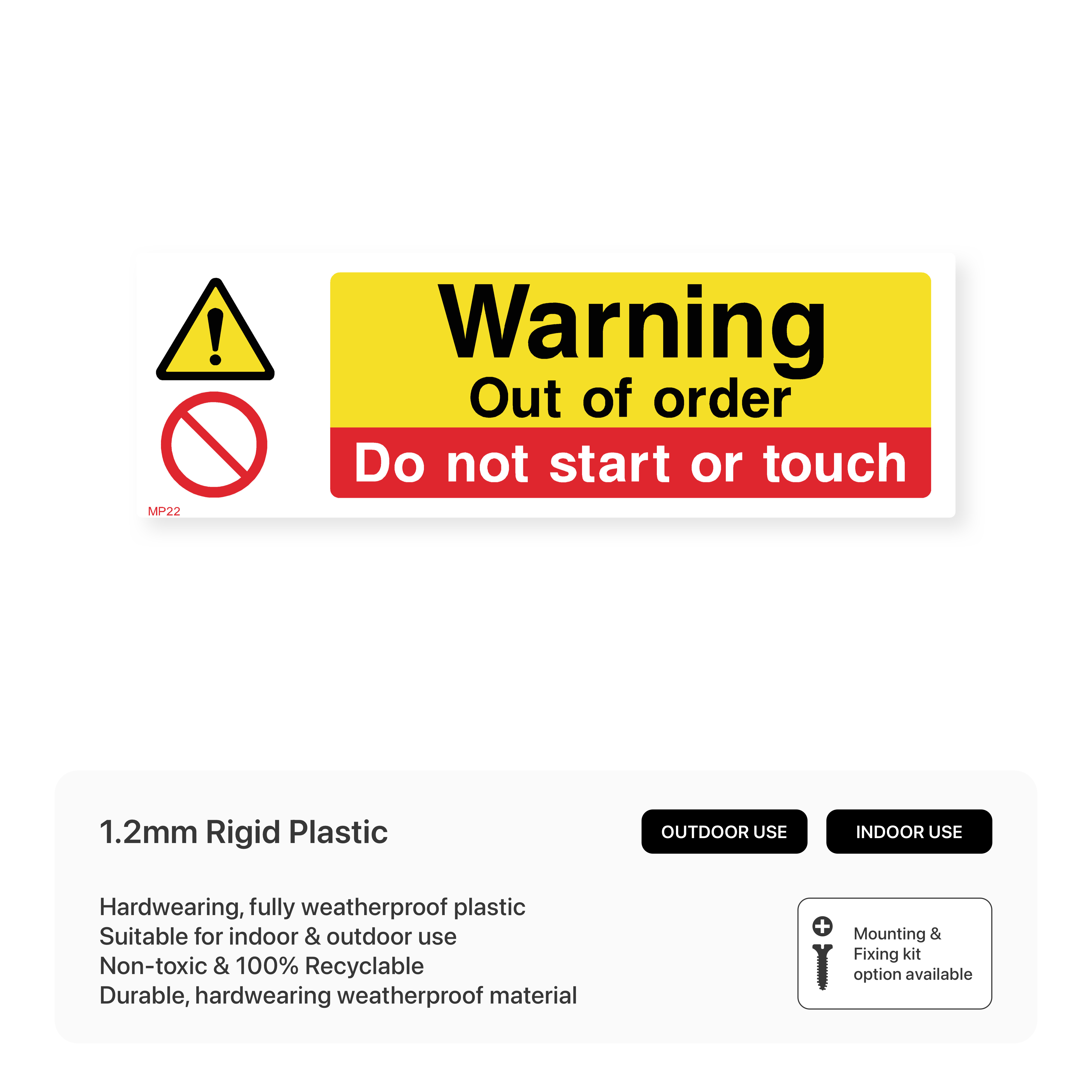 Clearly mark malfunctioning or unsafe equipment with our "Out of Order - Do Not Start or Touch" sign. Prevent accidents and unauthorised access to equipment undergoing repairs. Available in multiple sizes and materials, this sign is a crucial tool for maintaining a safe and efficient workplace.