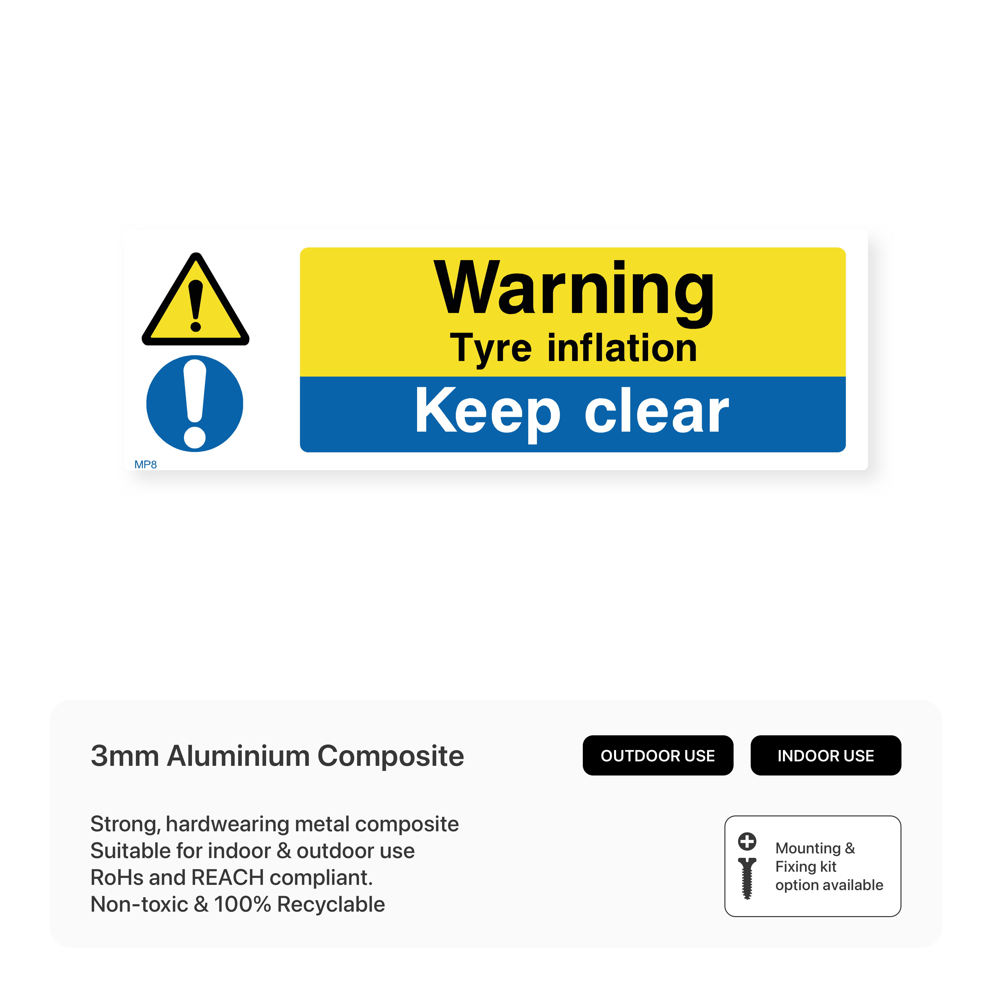 Ensure safety during tyre inflation with this warning sign. It alerts individuals to the potential hazards of tyre inflation and advises them to keep a safe distance. Ideal for garages, tyre shops, and any area where tyre inflation is performed.